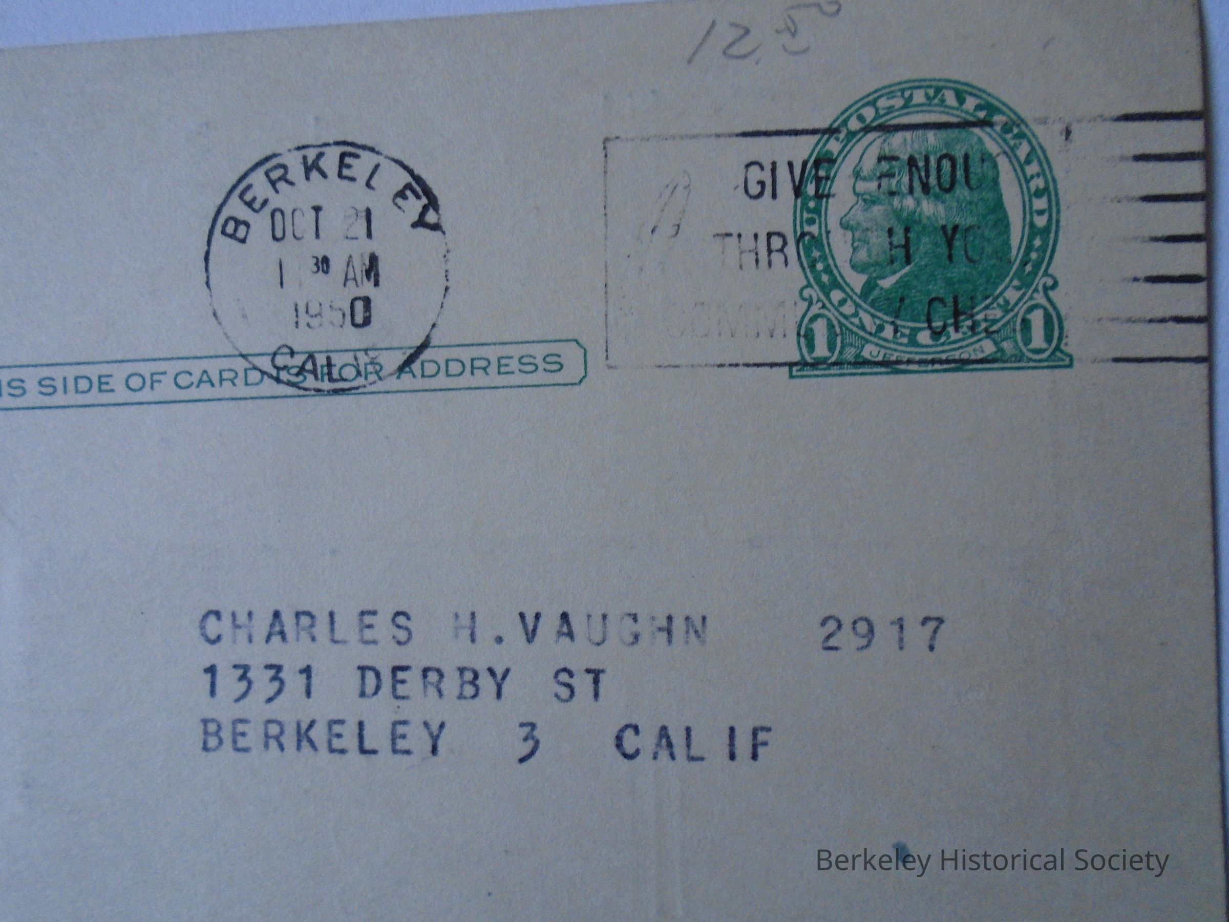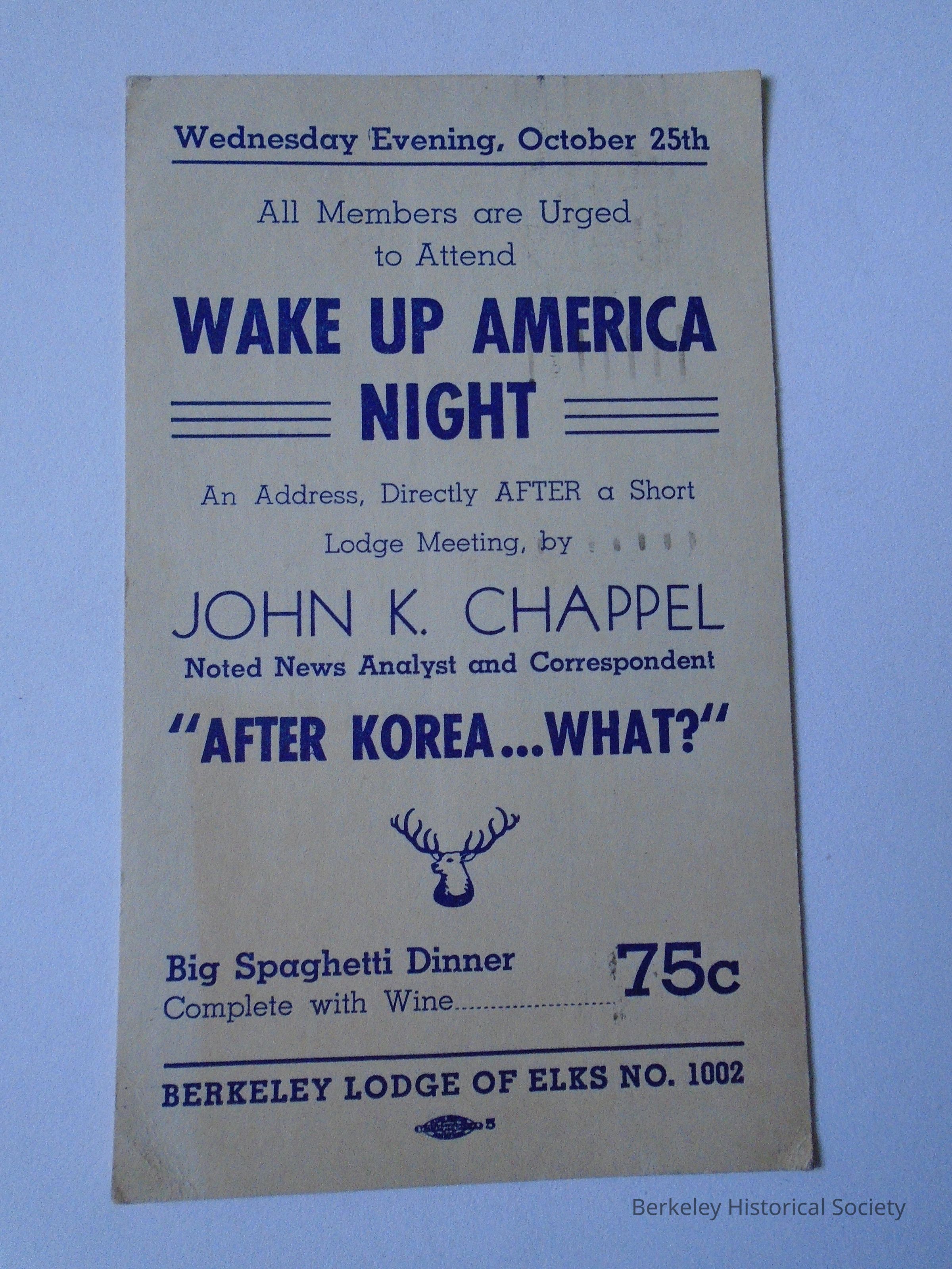 Paper postcard addressed to Charles Vaughn, 1331 Derby St. Berkeley 3, Calif. postmarked Berkeley 10/21/1950. Advertising: Wake Up America Night, speaker John K. Chappel, noted news analyst and correspondent, on "After Korea...What?". All Members are Urged to Attend. Wednesday Evening, October 25th. Spaghetti Dinner, complete with wine...75 cents. Sent by Berkeley Lodge of Elks No. 1002.Lexicon