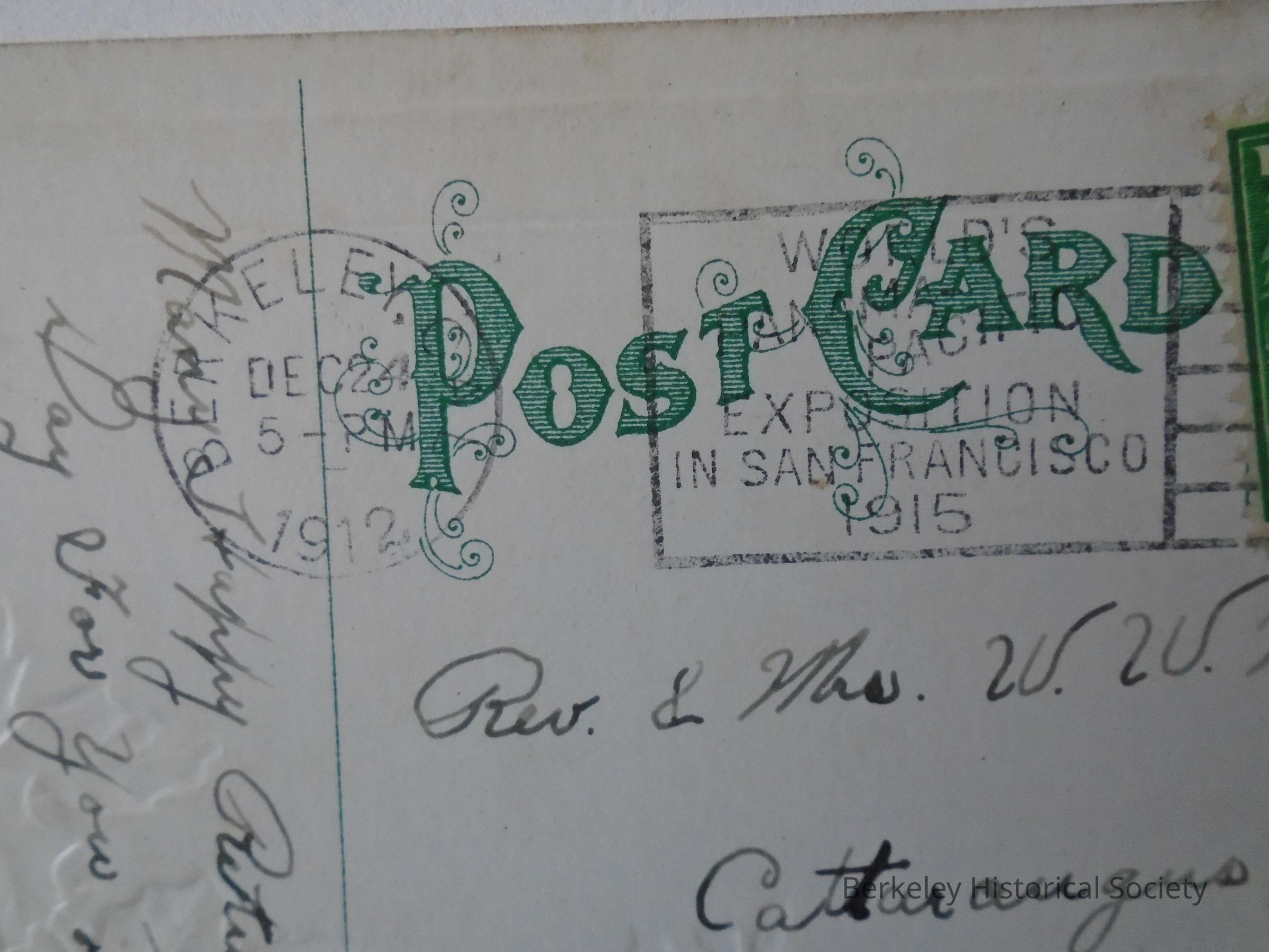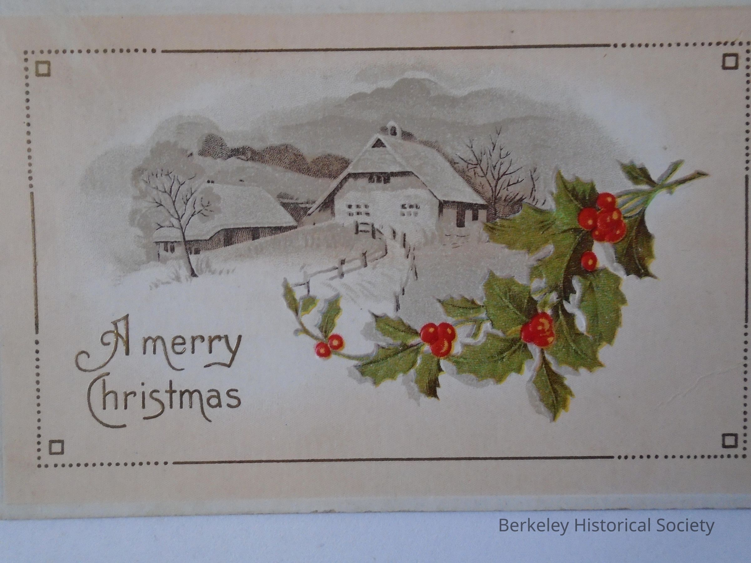 Paper postcard with picture of a house and holly and "A Merry Christmas". Reverse side note signed "from your grandson Holley McCoy" and postmarked Berkeley Dec. 1912 and stamped with World's Pan Pacific Exposition in San Francisco 1915 and 1 cent stamp. Addressed to Rev. Manning in New York state.
