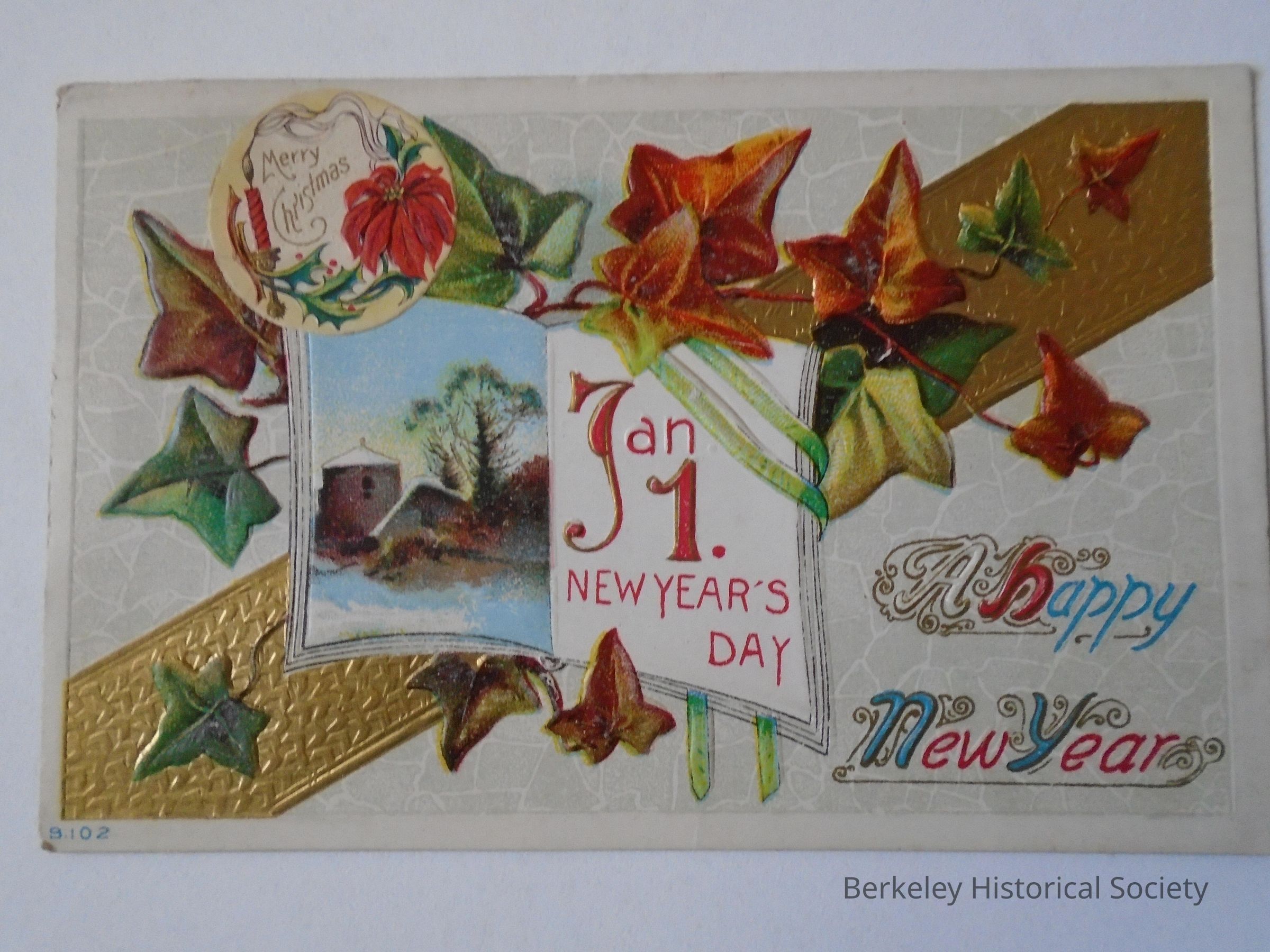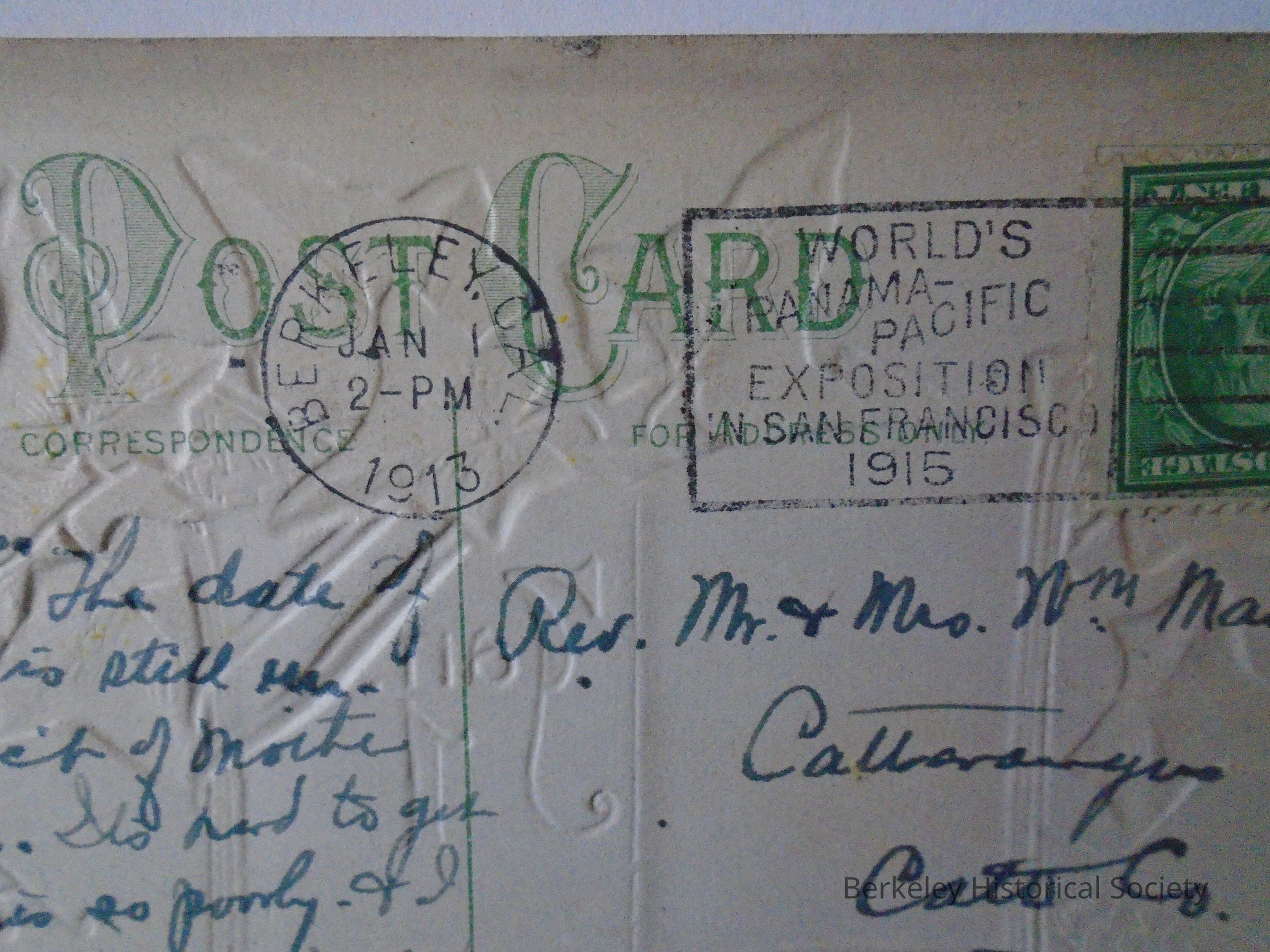 Paper postcard postmarked Berkeley Cal Jan 1 1913. Shows a New Year's Greeting "A happy New Year, Jan 1. New Year's Day" and "Merry Christmas". Decorated with leaves in gold, red and green. Sent to Rev Mr & Mrs Wm. Manning in New York from Harriet & Family. Also stamped with "World's Panama-Pacific Exposition in San Francisco 1915".