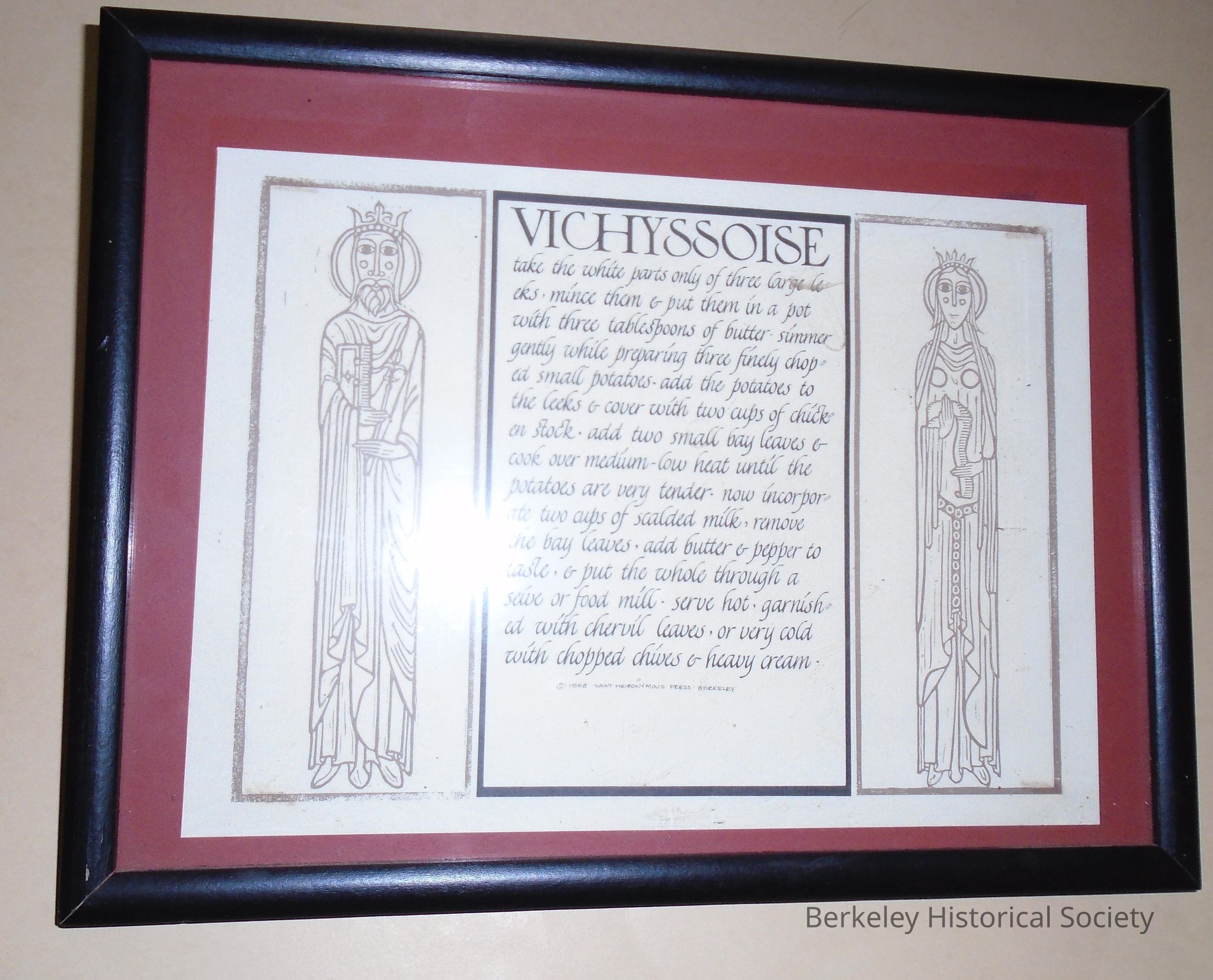 Framed poster print of recipe for Vichyssoise compiled by Alice Waters illustrated by David L. Goines. Copyright 1968 Saint Hieronymous Press, Berkeley.Made/Created