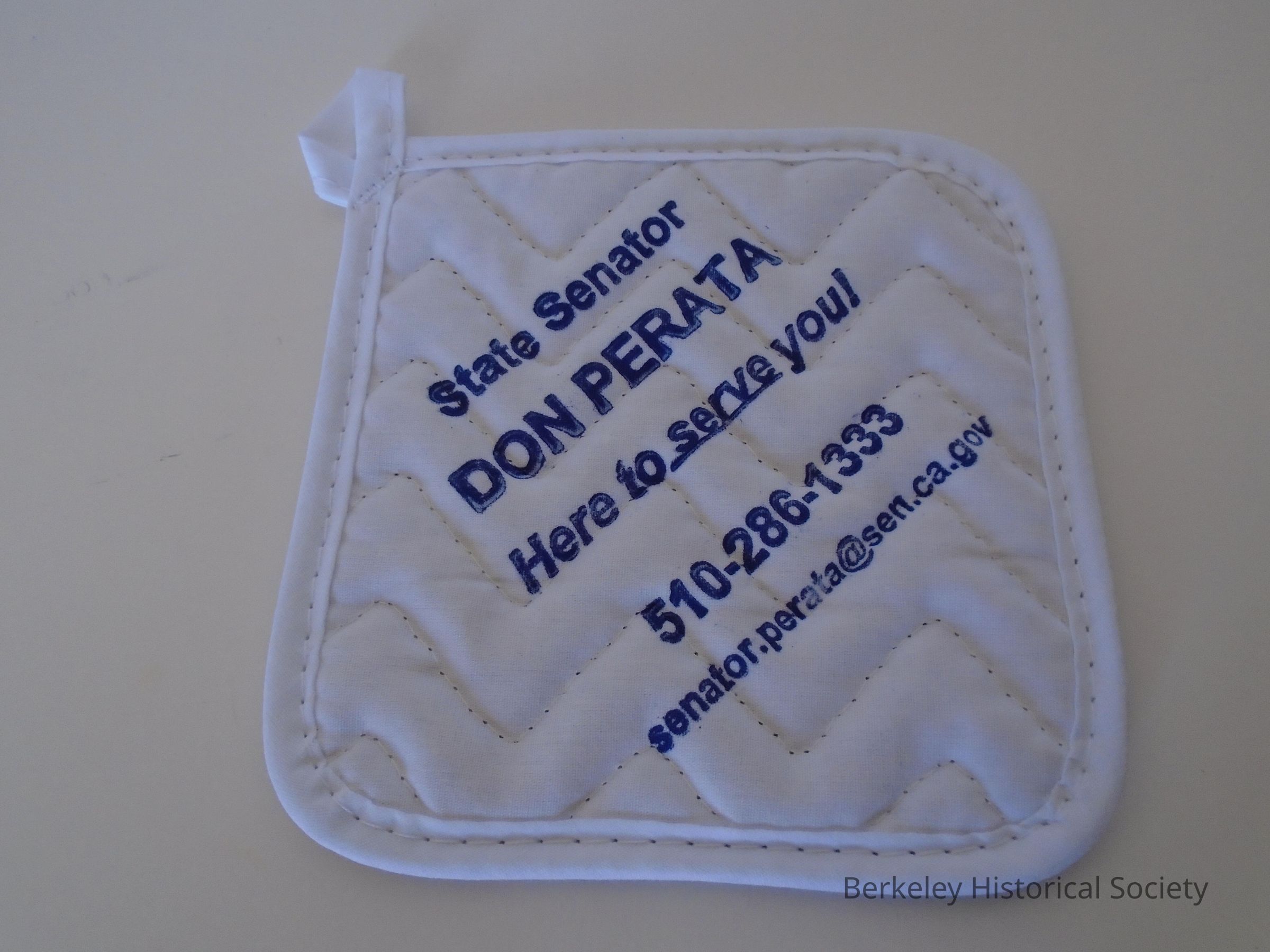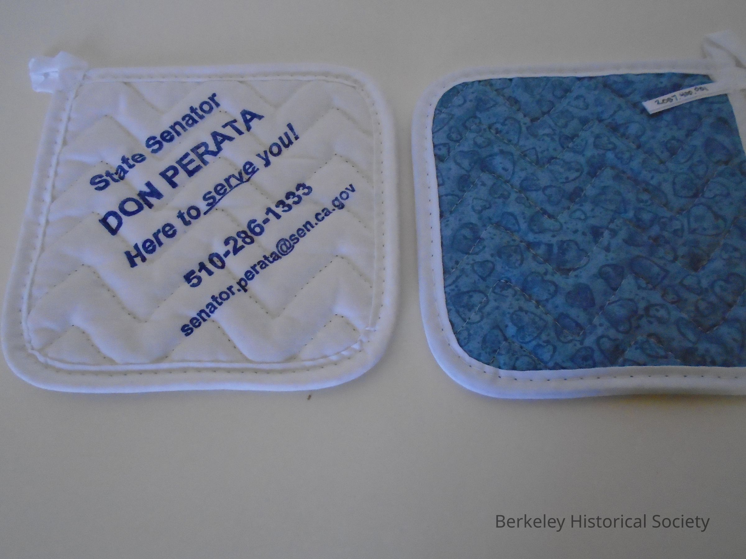 2 square, white, cotton quilted potholders. Political slogan: "State Senator Don Perata Here to serve you! 510-286-1333 senator.perata@sen.ca.gov". Print backing: 1with blue print, the other green print. (2 potholders.)