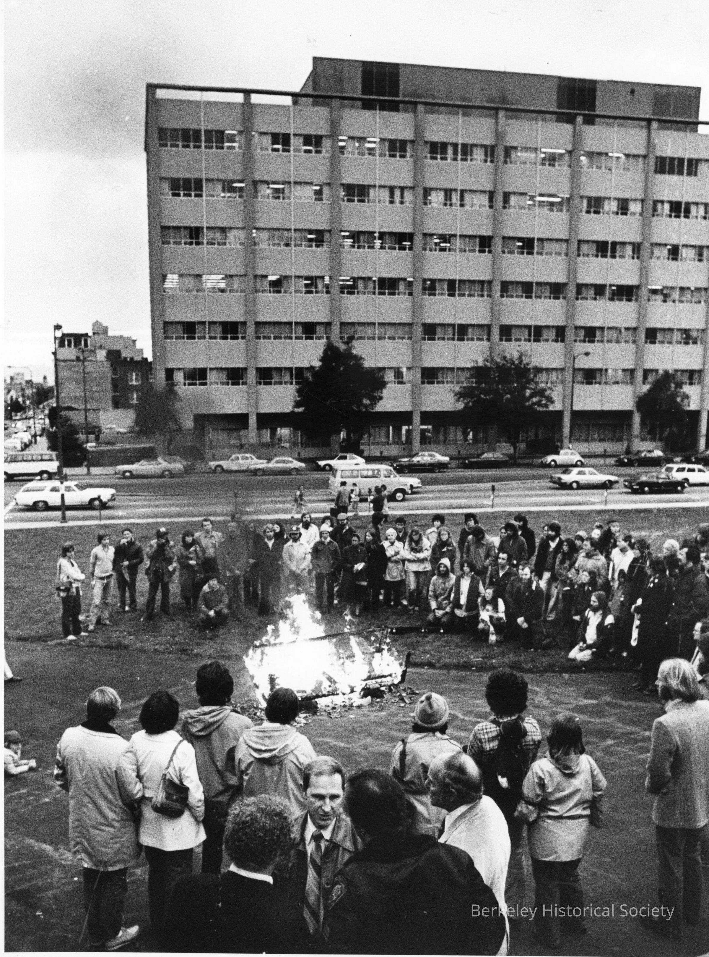 Crowd around burning object opposite University Hall, Oxford Street.