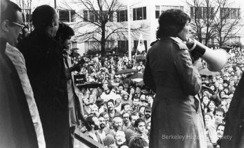 Milton Marks, Randy Alfred, Robin Tyler, the latter holding a bullhorn speaking to a crowd. Occasion unidentified.Other Names and Numbers