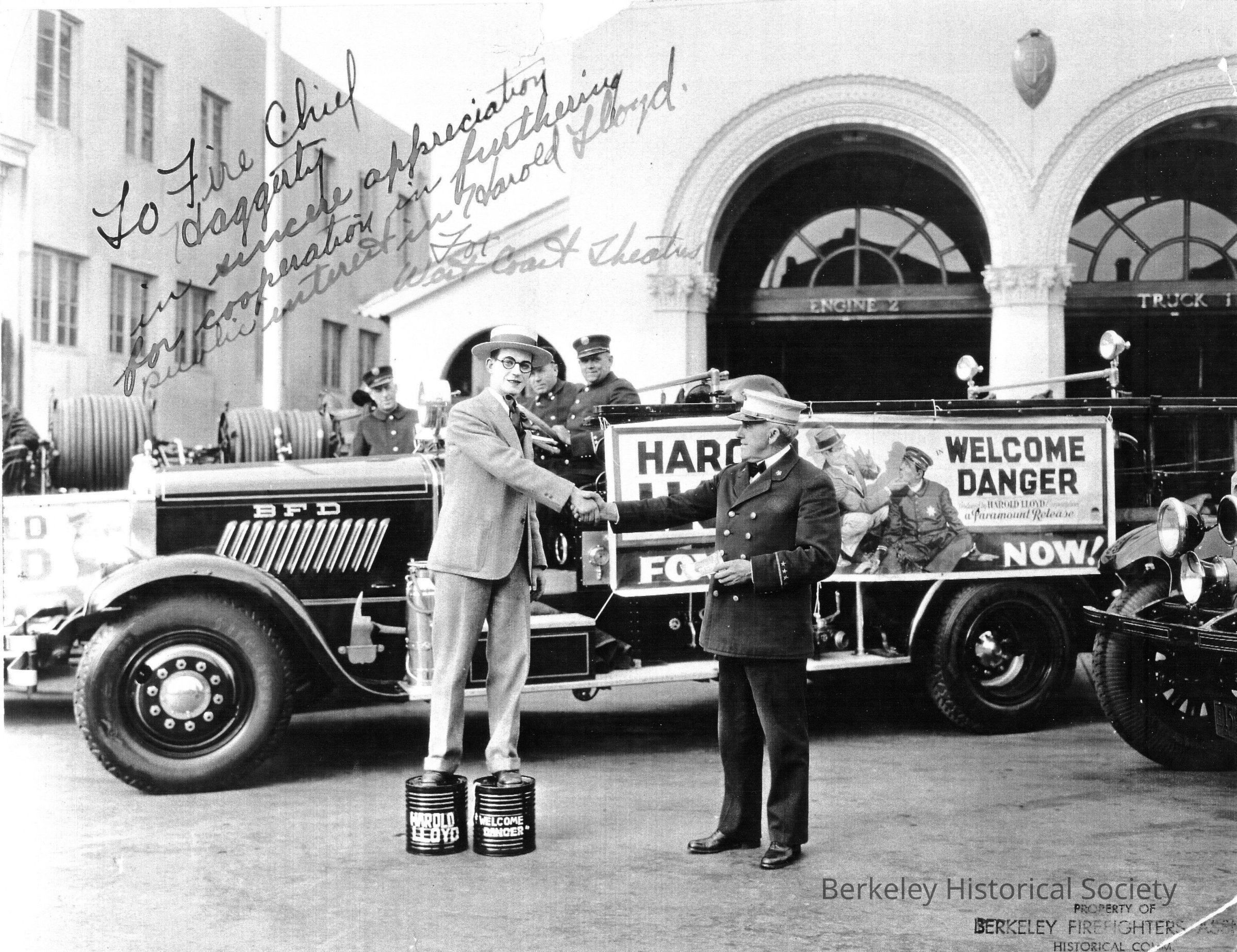 Harold Lloyd (actor) with Chief Daggerty shaking hands for Fire Department publicity shootMade/Created