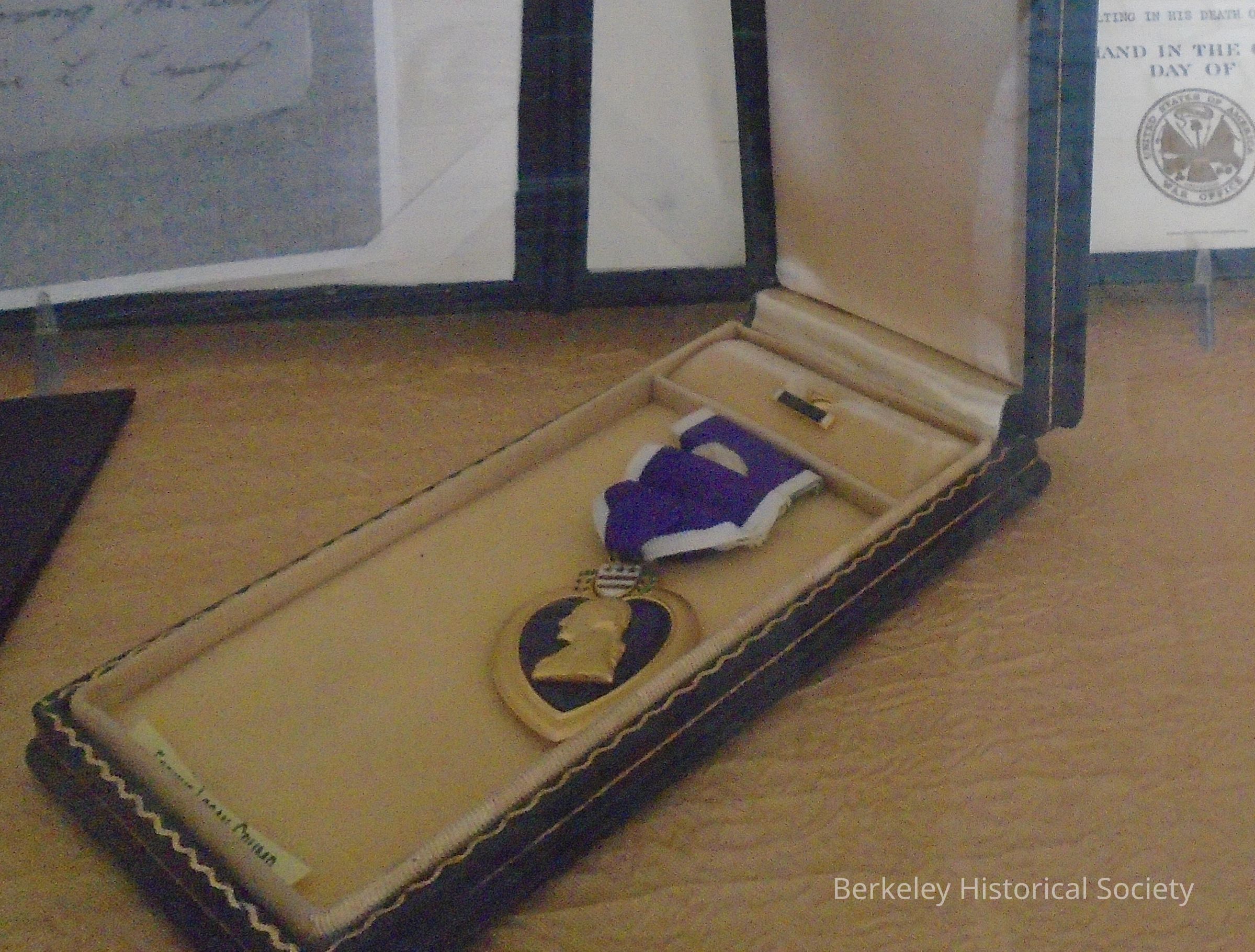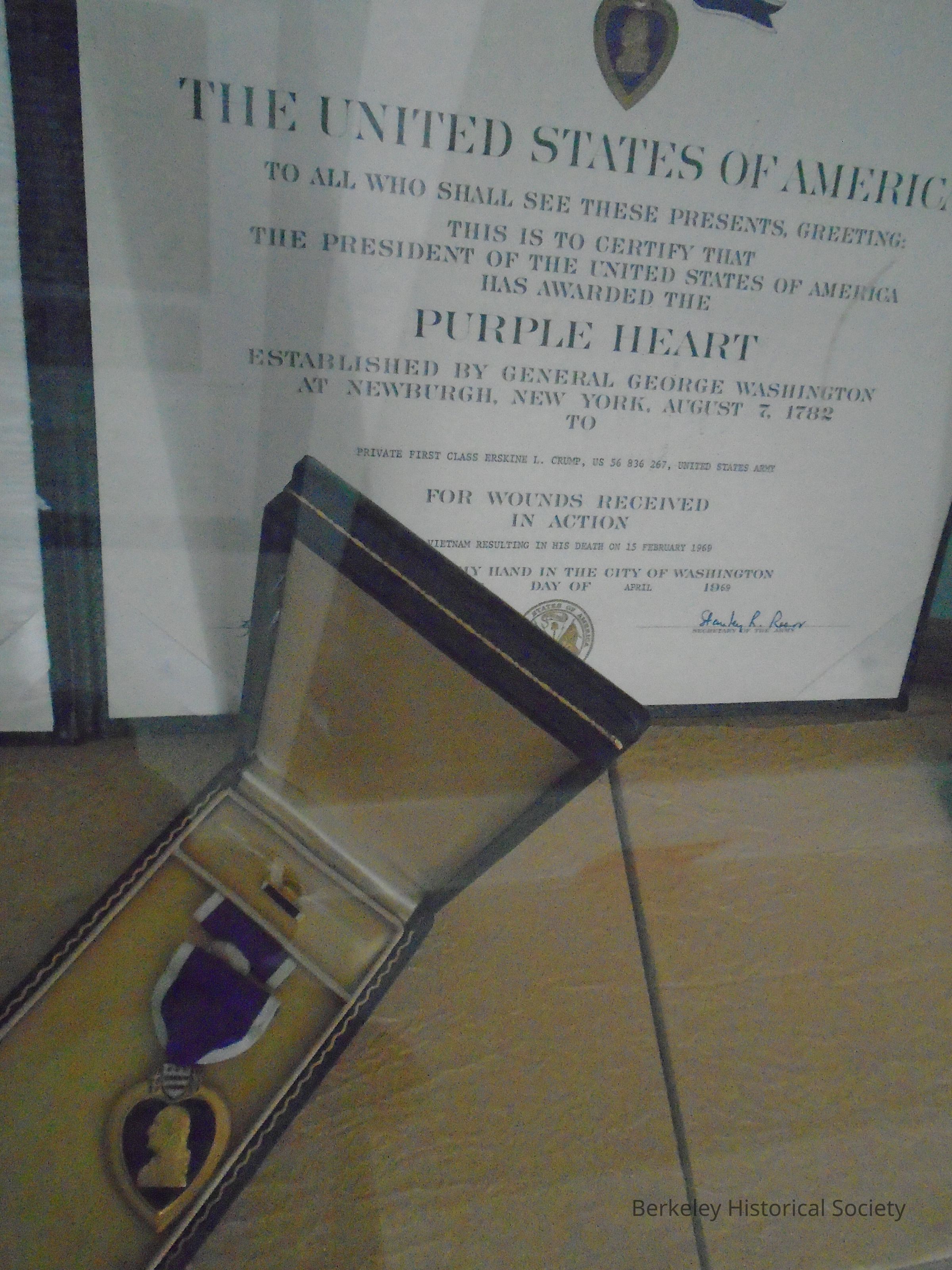 Purple heart medal in navy blue case with gold lettering. Heart shaped medal in gold and purple with profile of George Washington, hanging on a gold and purple ribbon/bar. Separate bar pin in gold and purple. Awarded to Army Private First Class Erskine Logan Crump 4/18/69. Born 4/3/48. Died in Vietnam 2/15/69. See also Vietnam Veterans archives box 2015.051.