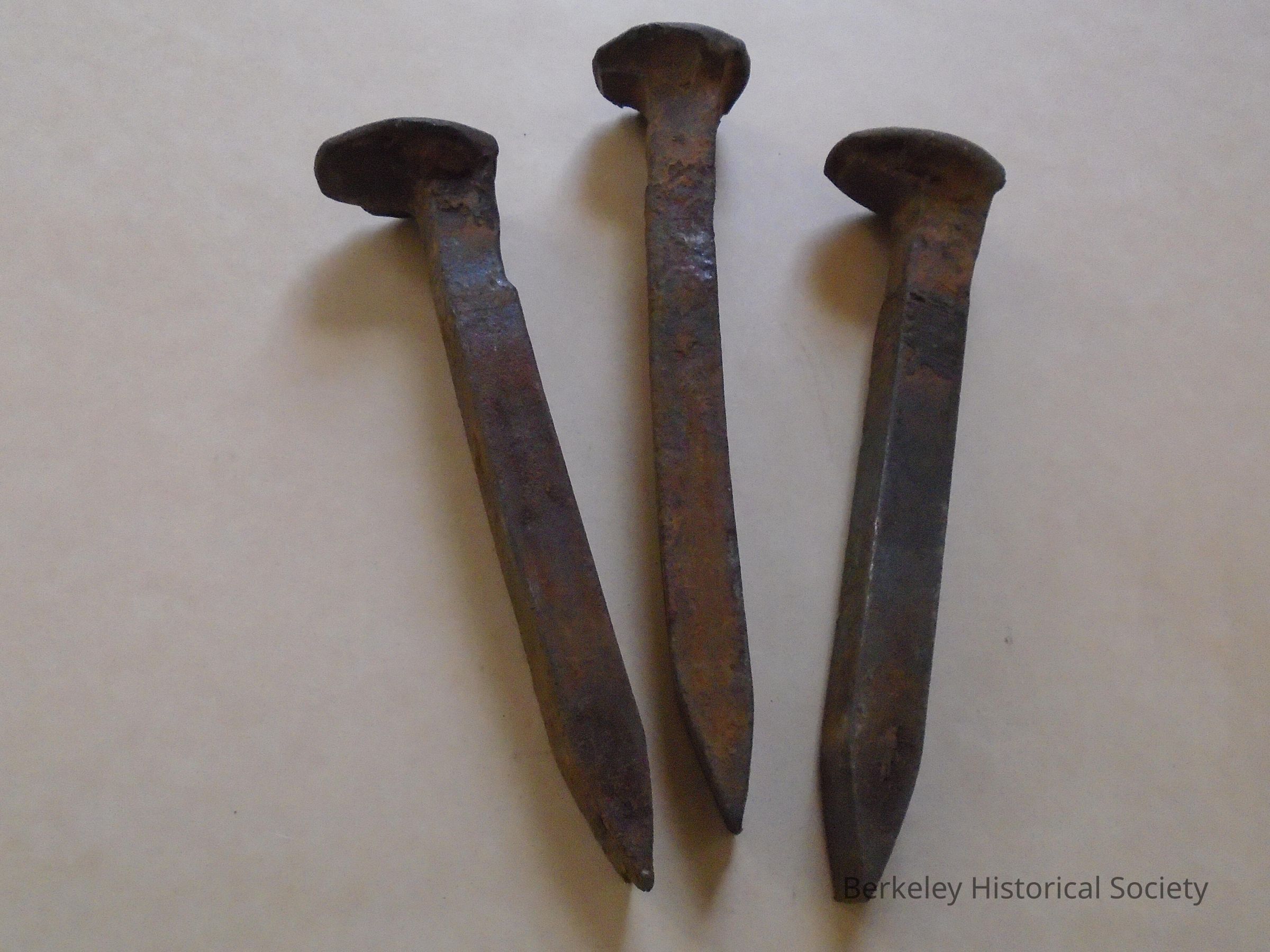 1 Inch round head, 6 1/2 inch square body, slightly off-center from head. All three very rusty. Found on the roadbed of Santa Fe Railroad, Addison St. Crossing.