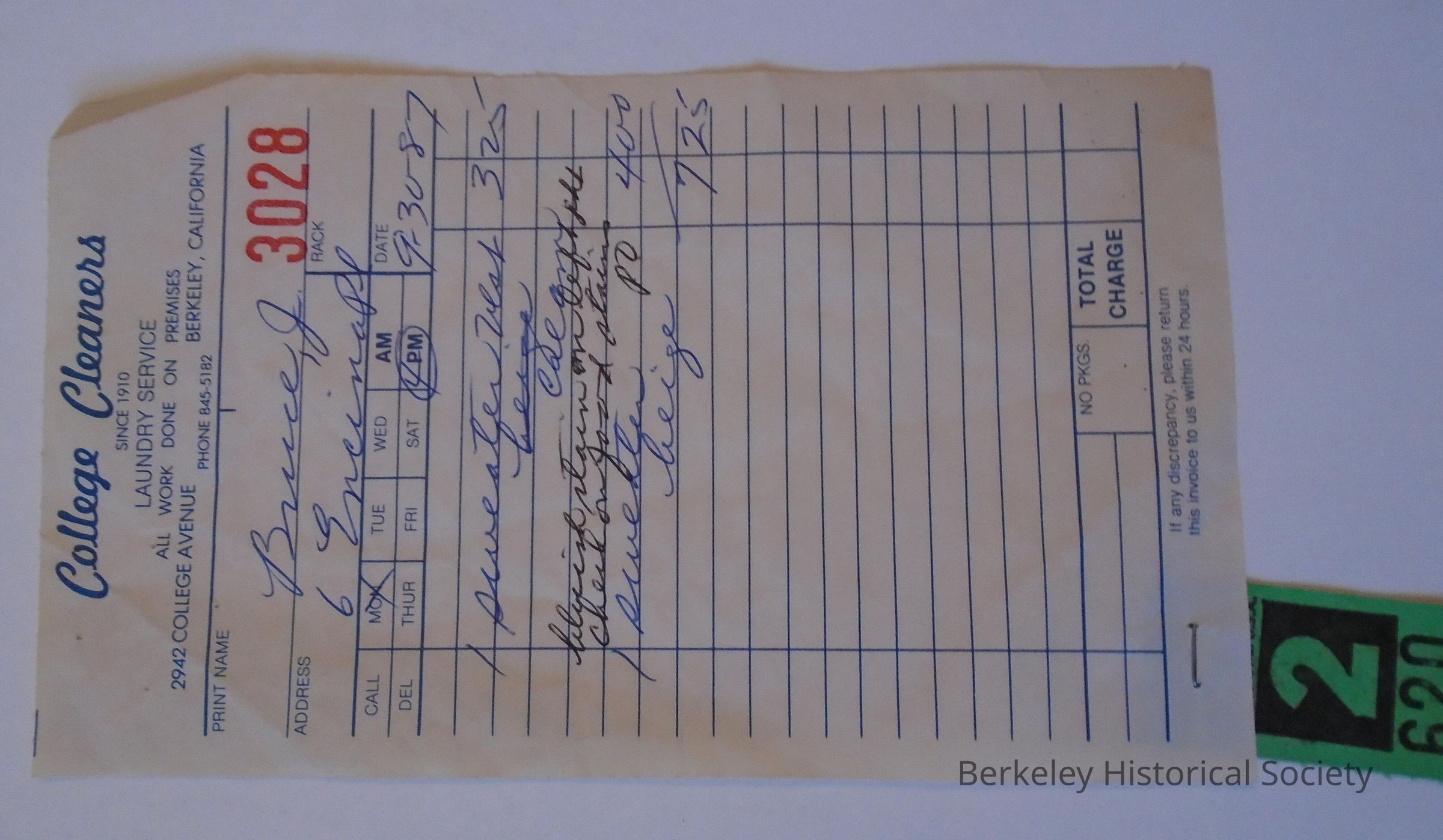 Paper receipt for College Cleaners, 2942 College Avenue, Berkeley, California, Phone 845-5182. 2 sweaters cleaned. Green tag #2 stapled at bottom.