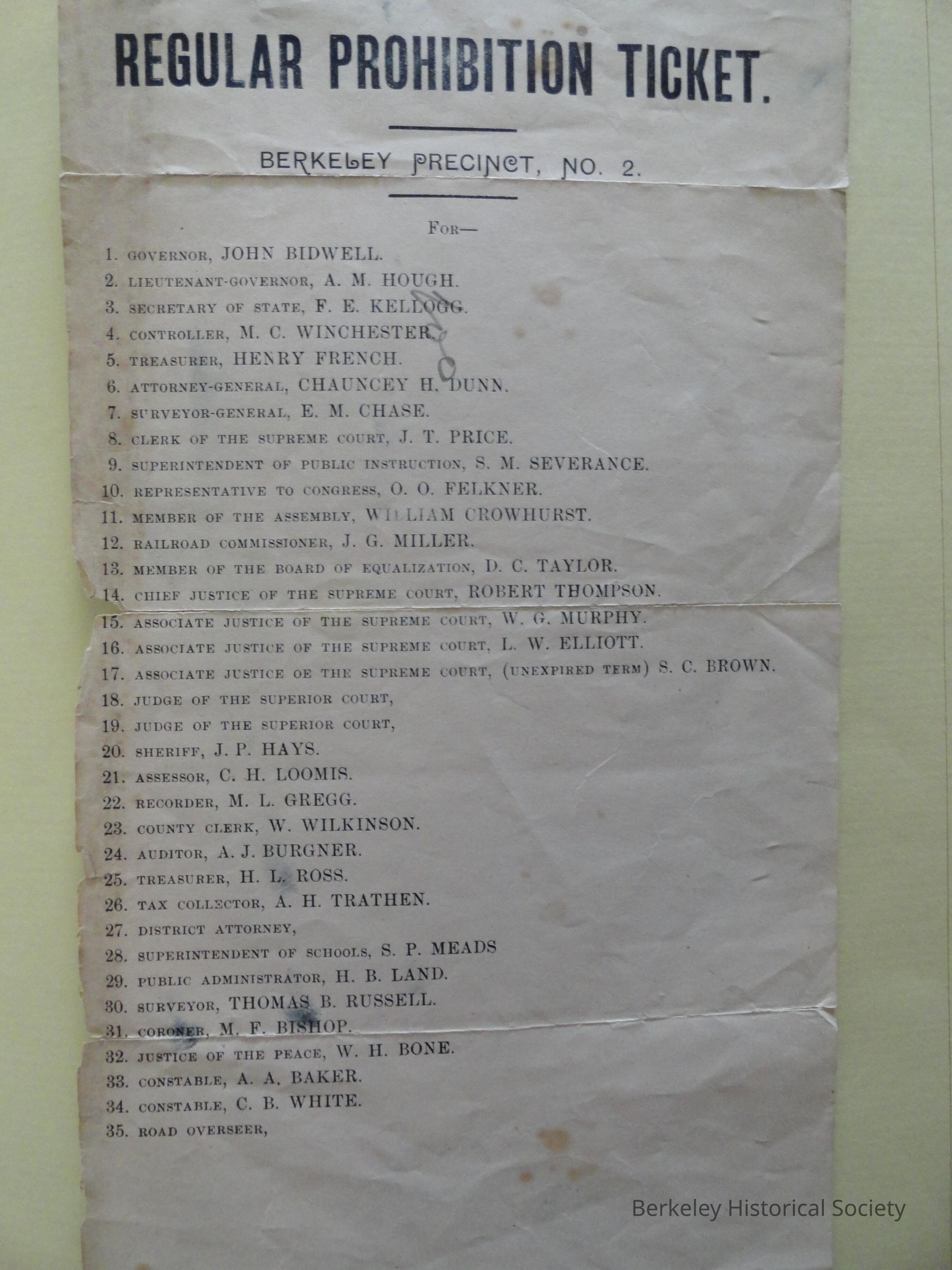 1 - flier: election ticket. John Bidwell for Governor; he ran on the prohibition ticket in 1880.