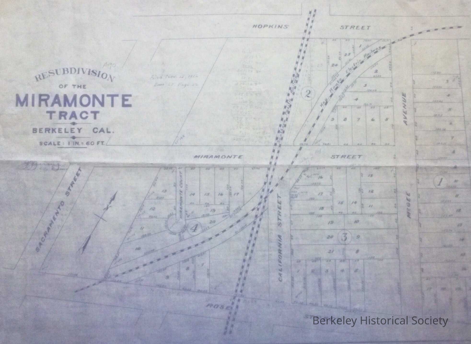 Miramonte Tract, Miramonte Avenue, Sacramento Street, McGee Avenue, Rose Street, Hopklins Street, SP tracks, Key System tracks, Real PropertyDimensions