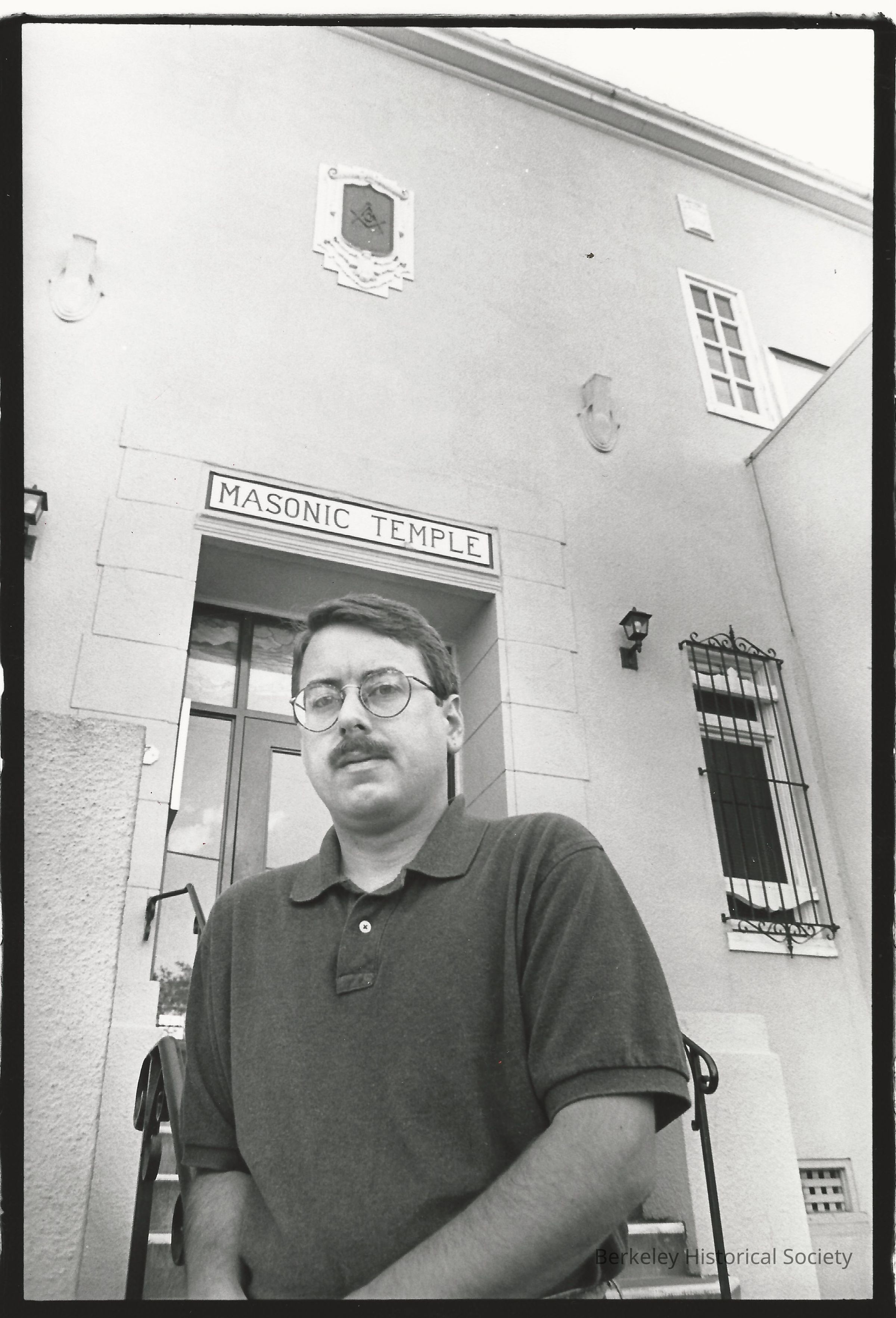 "Masonic Temple story." Standing in front of Masonic Temple.
