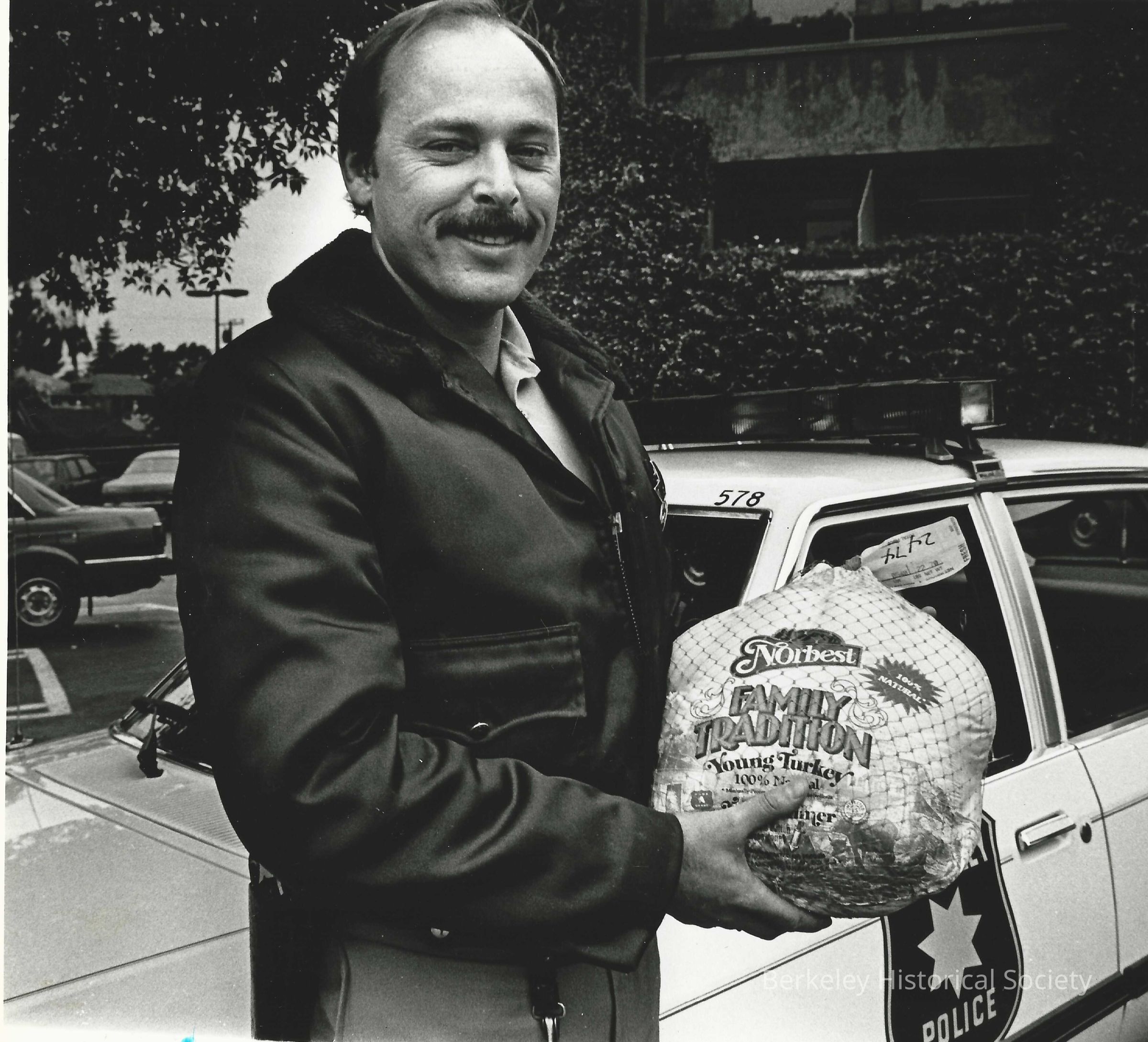 Police officer, holding a thanksgiving turkey