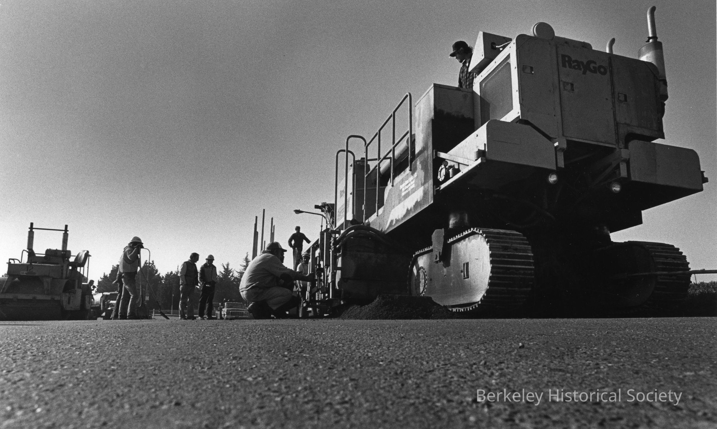 Machinery and workmen on extension of University Avenue leading to the Yacht Harbor; photo taken from ground level; men working on machine.Other Names and Numbers