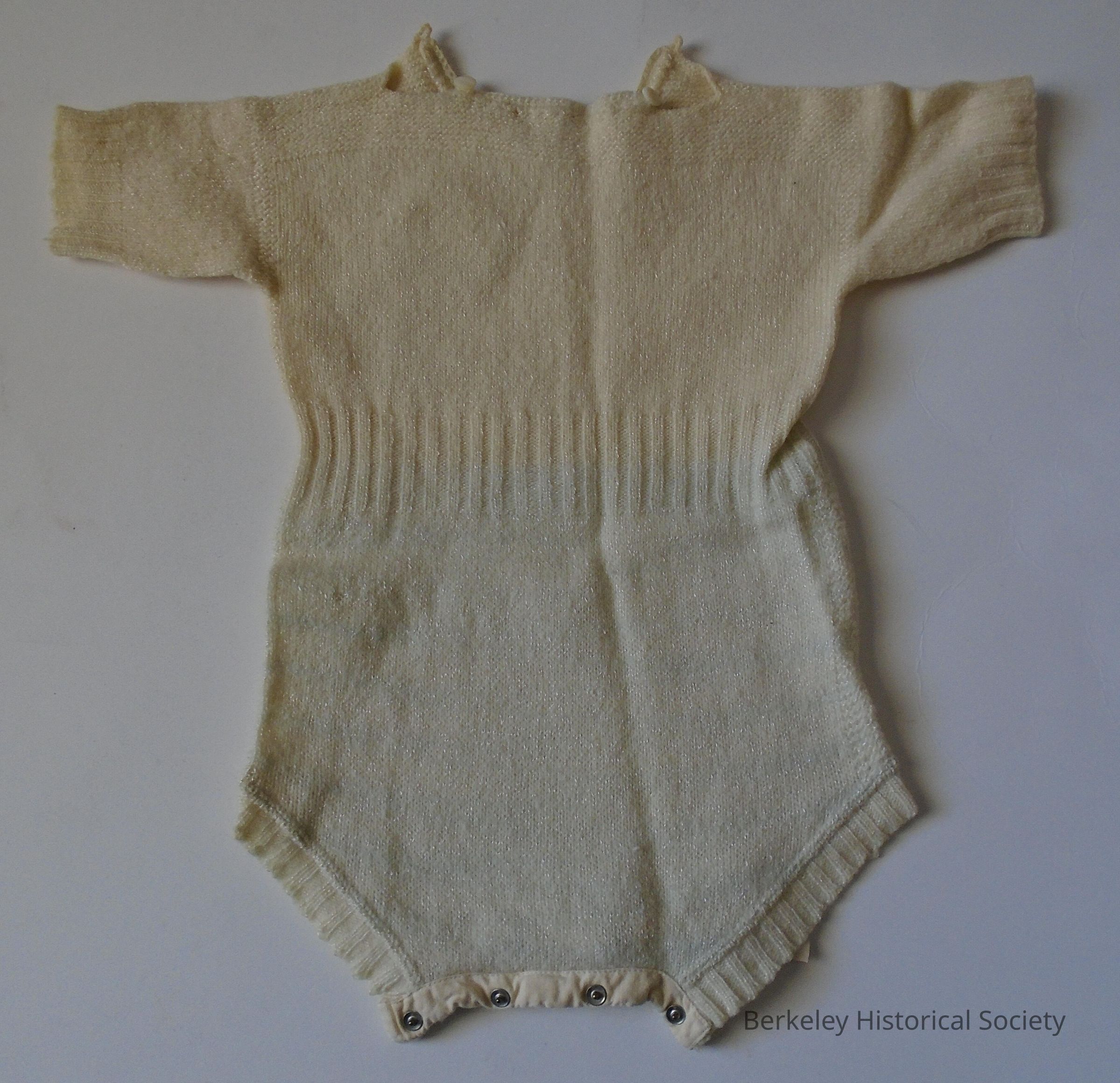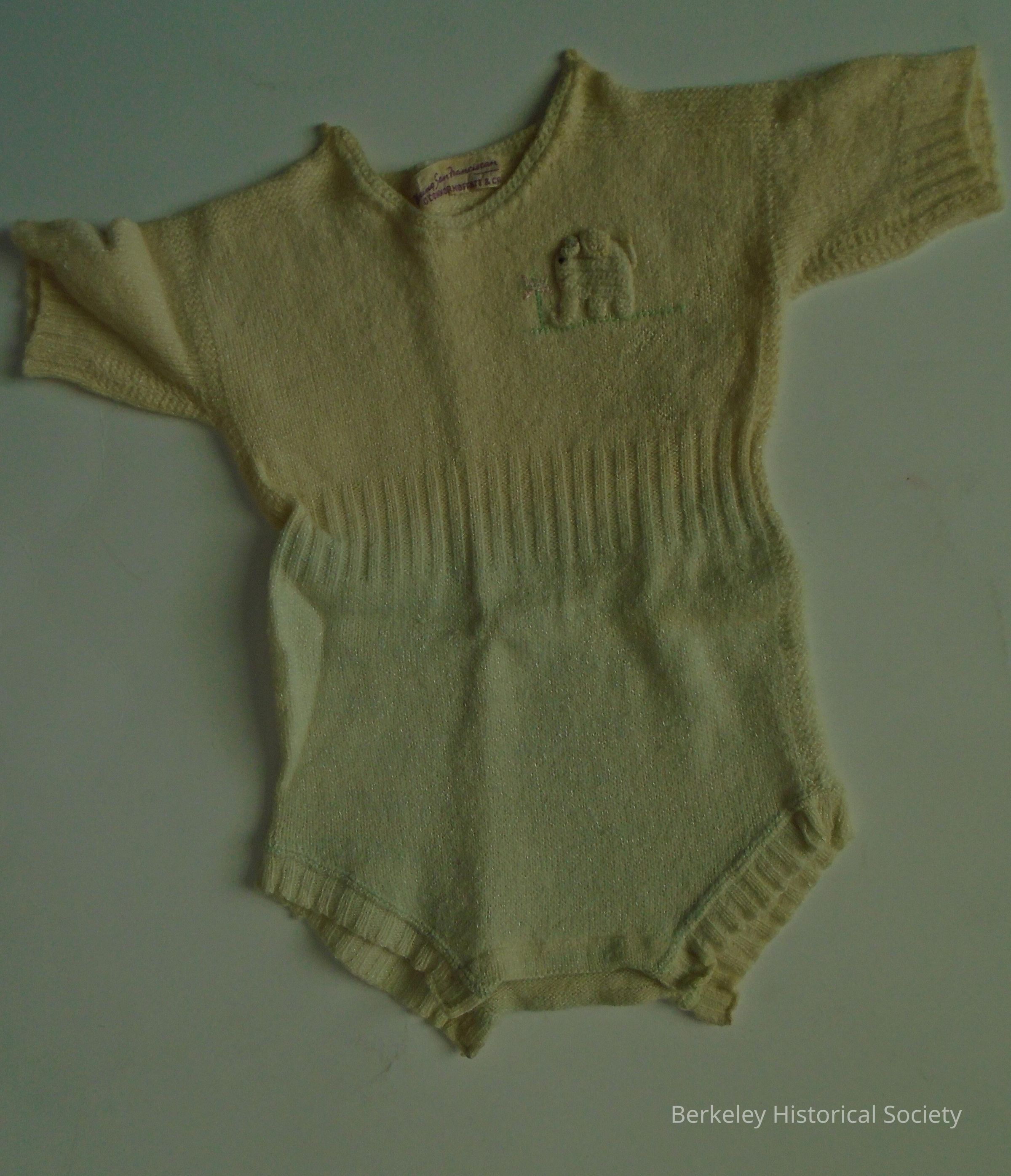 White wool baby romper. Bottom slightly tinted blueish, perhaps from washing. Short sleeves and legs. Opening at neck has 2 buttons, bottom has snaps. Small elephant embroidery on top, left side. Label says "Young San Franciscan, O'Connor, Moffett and Co." See family info in 1978.002.265