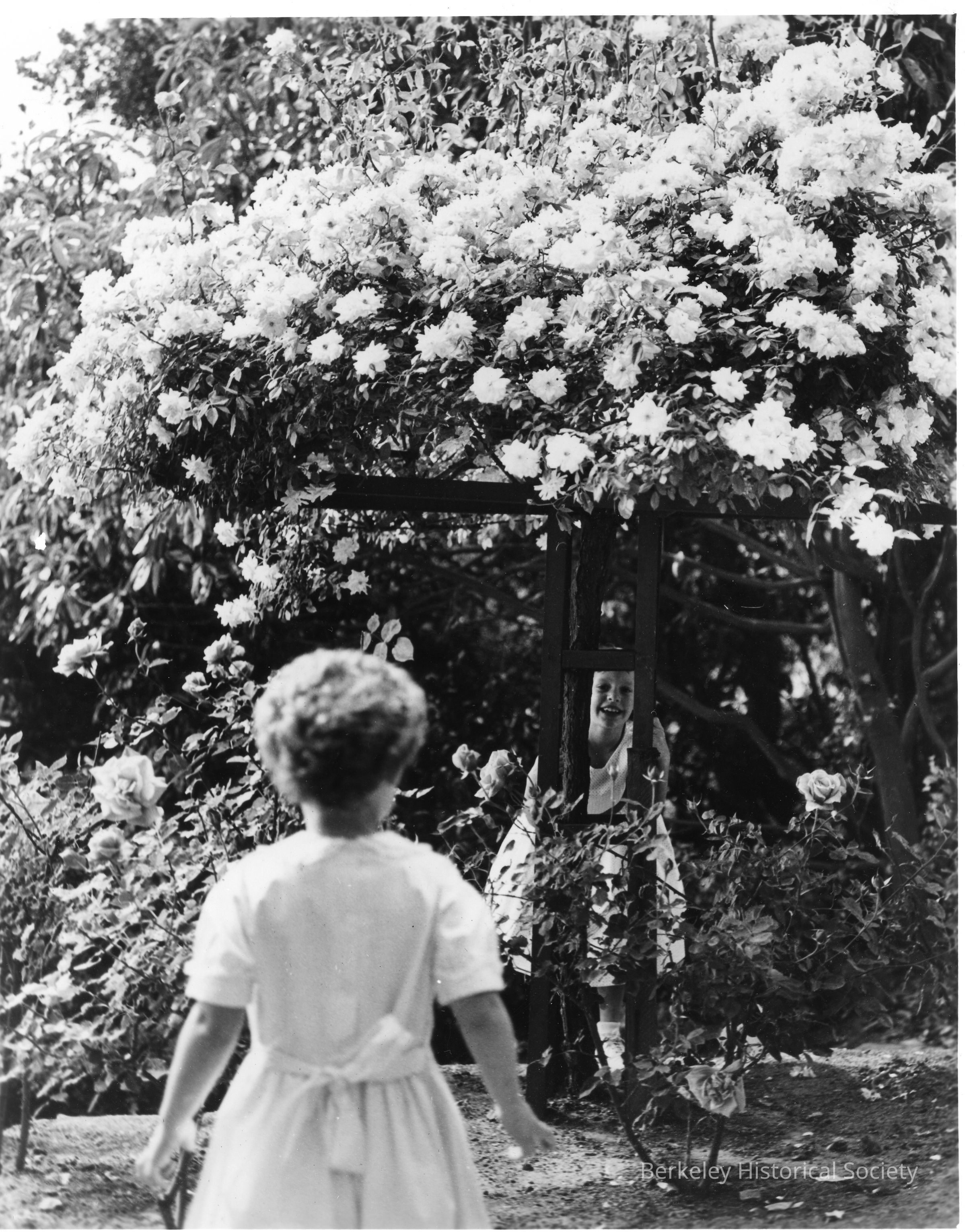 Two girls looking at each other through the support for the pergola.