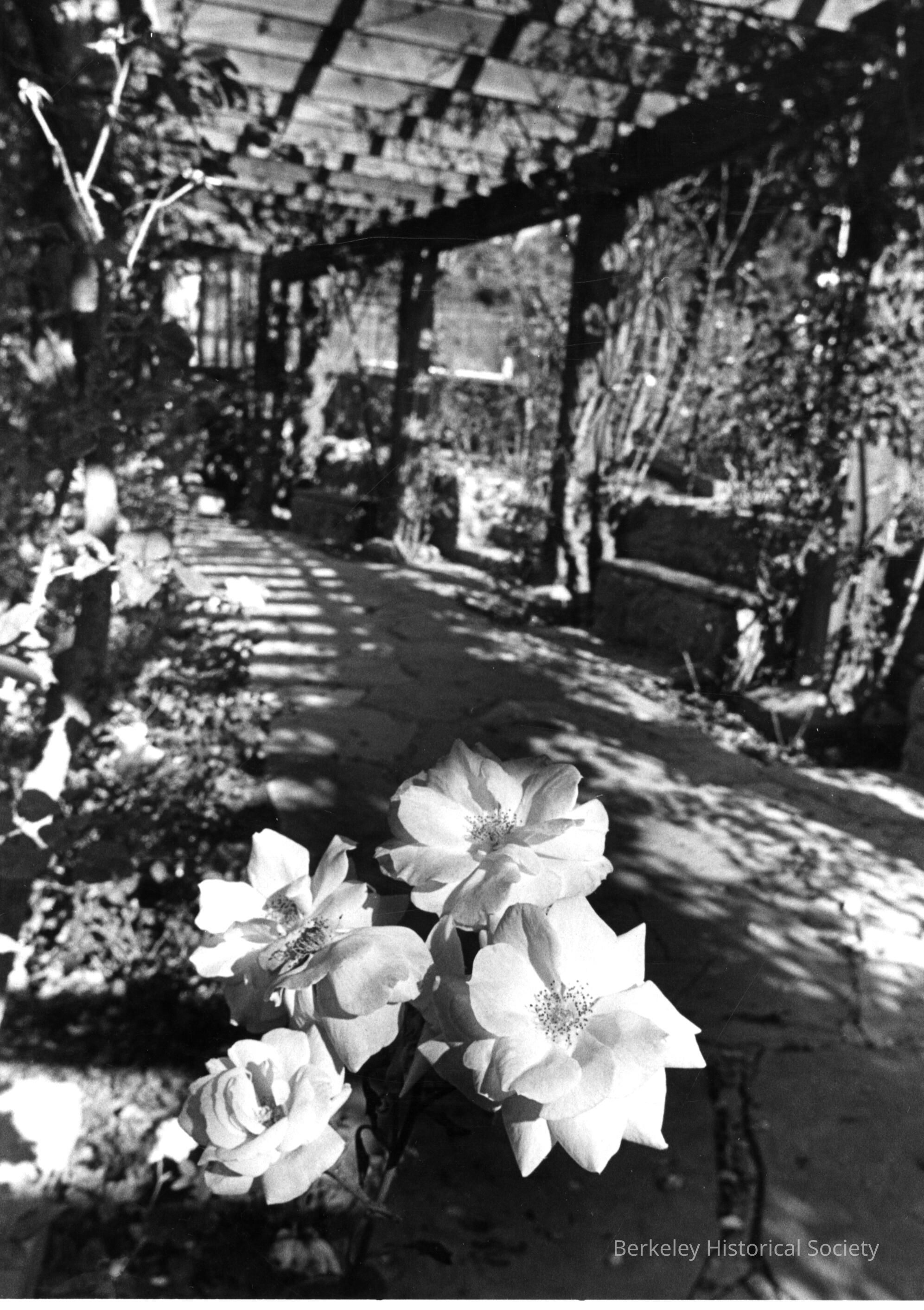 Curving path under pergola, blooming flowers in foreground.Other Names and Numbers