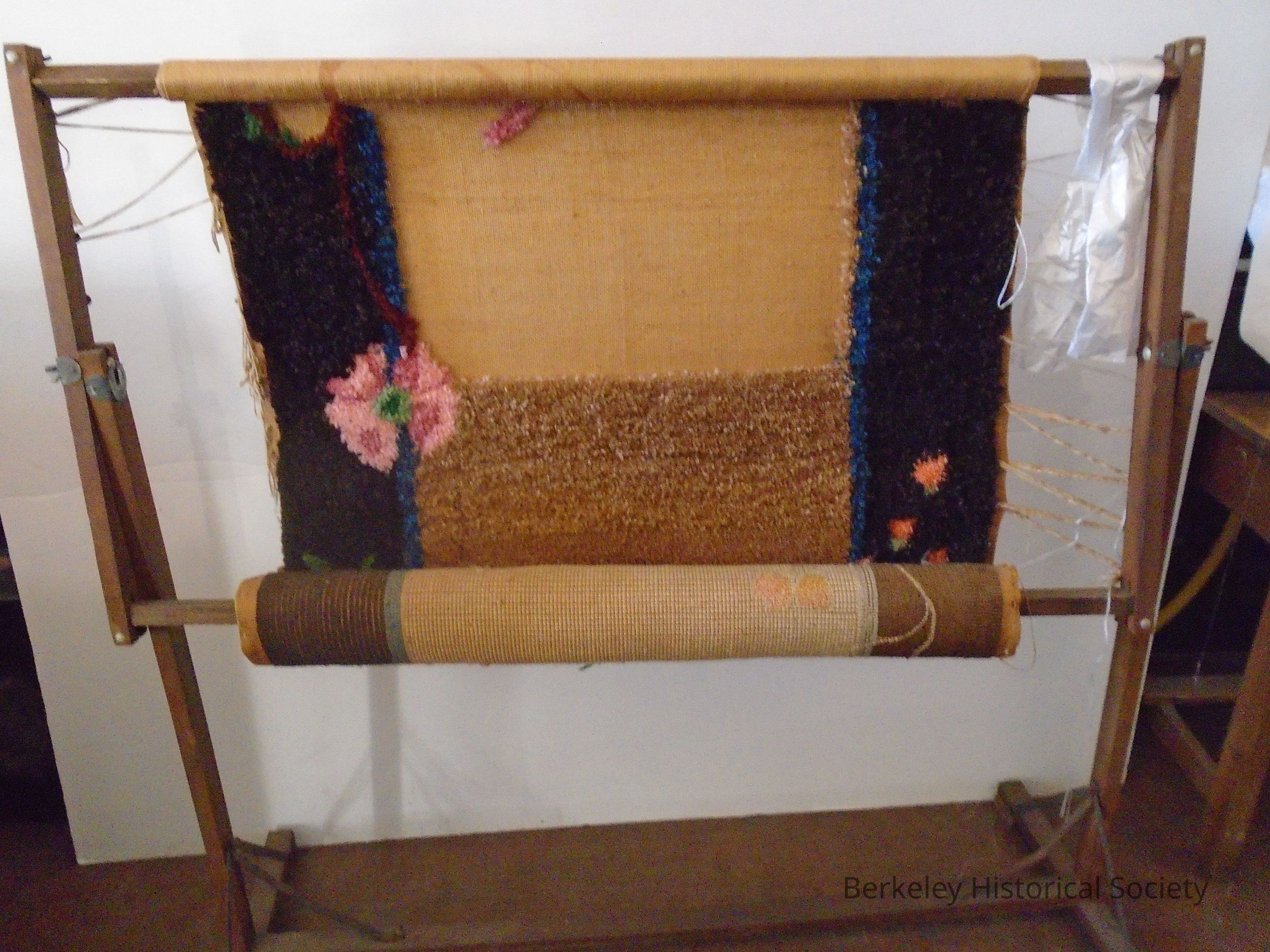 Wool, hooked rug on a wood frame, with the wood frame sitting on a 2 legged stand. Rug is unfinished. Rug is attached to frame by cord looped over "tacks". The frame sits on the stand and is attached by a "nut" on each side, which can be tightened so rug/frame is angled in different ways. Rug is the work of Mrs. Trinidad and Ms. Jacinto. Pink floral design on a beige and burgundy background.
