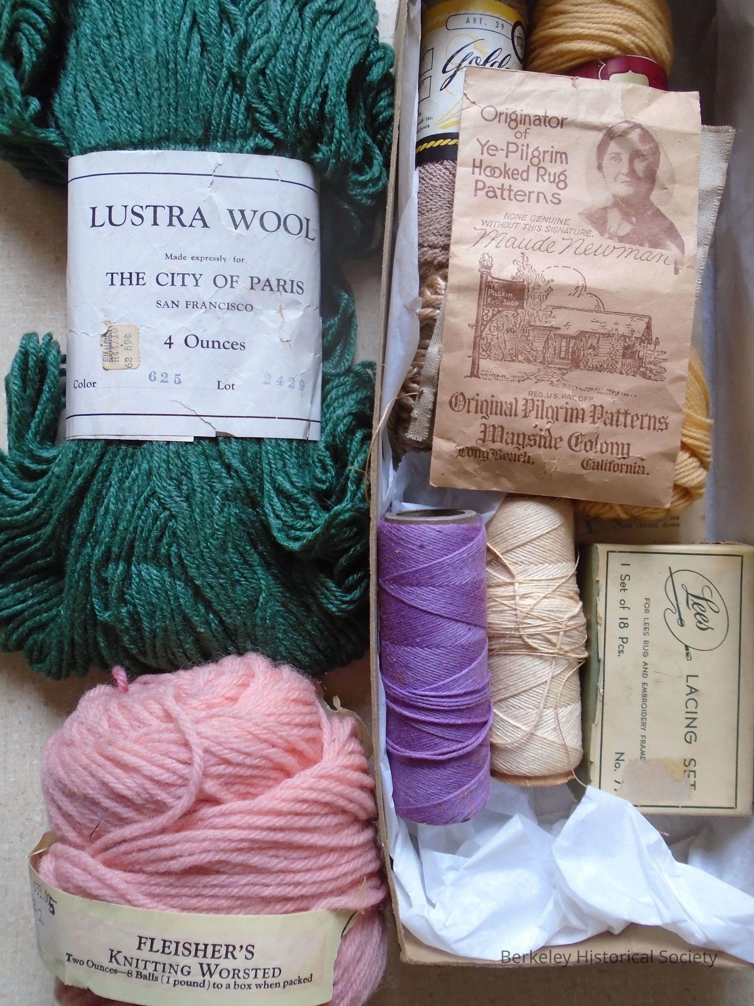 Also included, in a small separate Golden Gate yarn box: misc. yarns (5 Fleisher's wool, 1 Fleisher's nylon 'n wool with J.F. Hink & Sons price tag of 69cents, 1 wool Golden Gate , 2 cotton ); misc. tools including Wonder needles and directions in a paper packet brand "Maude Newman/Ye-Pilgrim Wayside Colony, Long Beach, CA" ; scissors; boxed Lacing set (Lees brand); Ye-Pilgrim label for the rug; Fleisher Yarn advertisement; City of Paris, San Francisco receipt for yarn with Mrs. Trinidad's name and address at Francisco St. in Berkeley. See also 2002.033.006 (oversized storage): rug on frame by same people.Made/Created