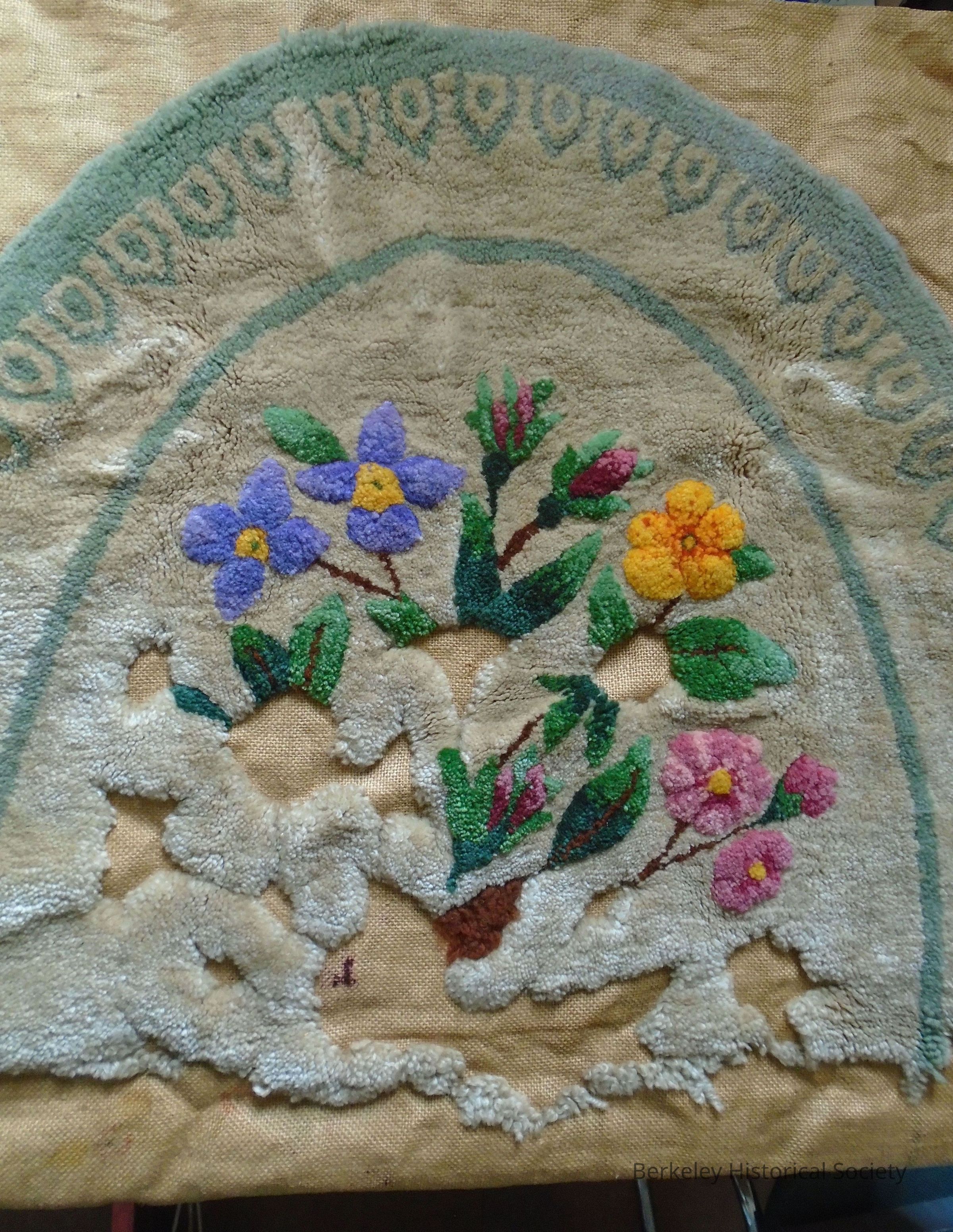 Oval, wool tufted rug, partially completed. Colored flower pattern in center, beige background with green-design edging. Rug is the work of Mrs. Trinidad & Ms. Jacinto. Included in the box are samples of yarn (9) : pinks, green, beige, gold, brown. Label on rug shows portrait and text: Maude Newman Originator of Ye-Pilgrim Hooked Rug Patterns.