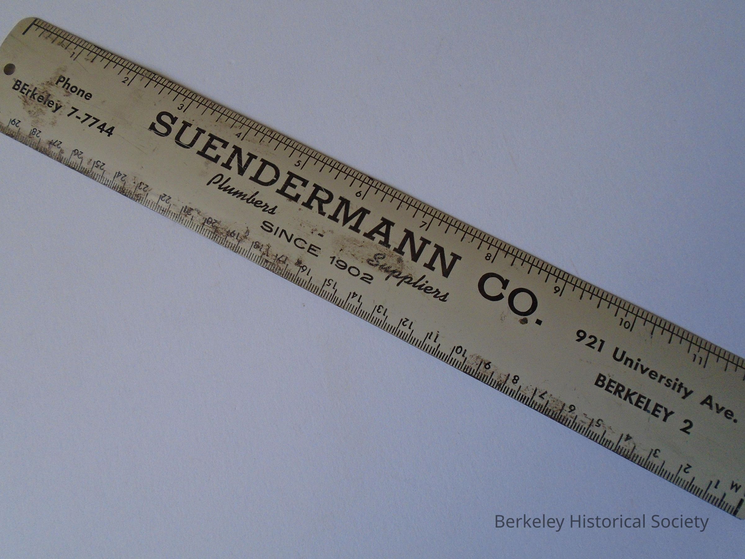 12" metal ruler advertising "Suendermann Co. Plumbers Supplies SINCE 1902 Phone BErkeley 7-7744 921 University Ave. Berkeley 2".