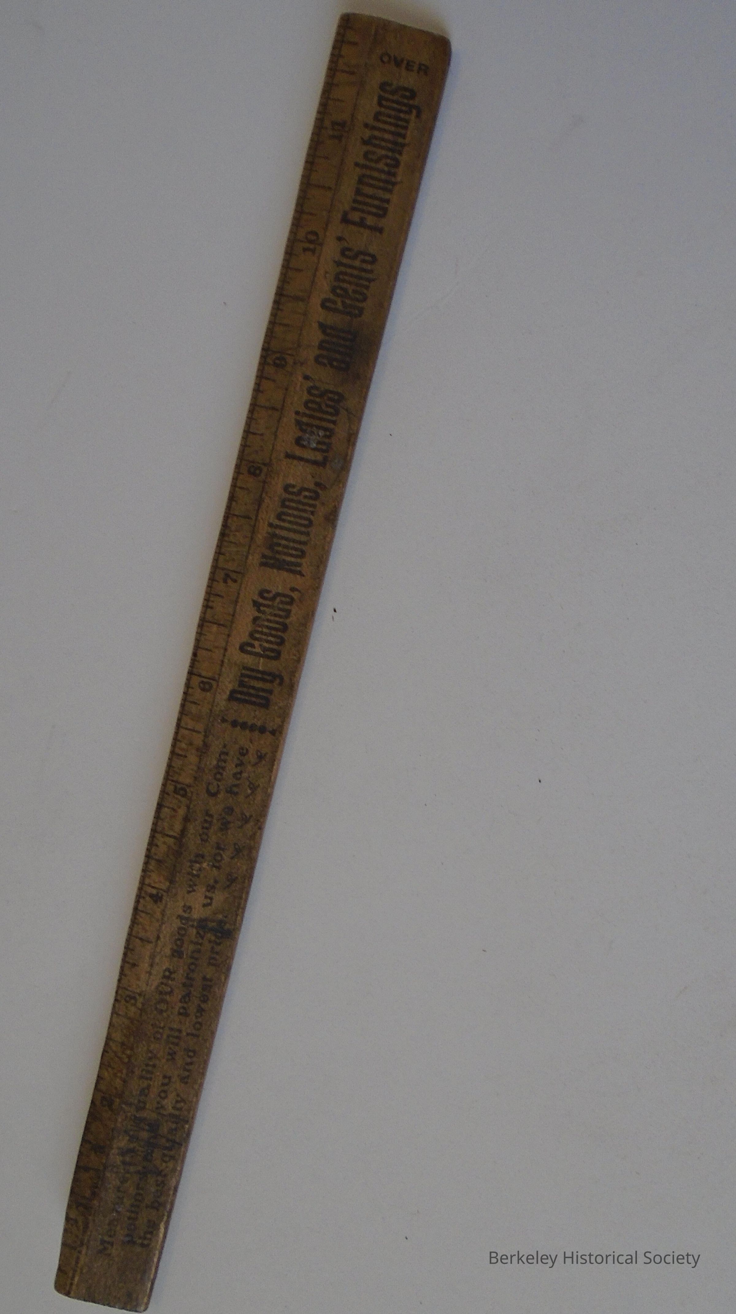 Wood ruler advertising T.J.Donogh, 1466 Shattuck Ave., North Berkeley, Calif. , Dry Goods Notions, Ladies' and Gents' Furnishings.Lexicon