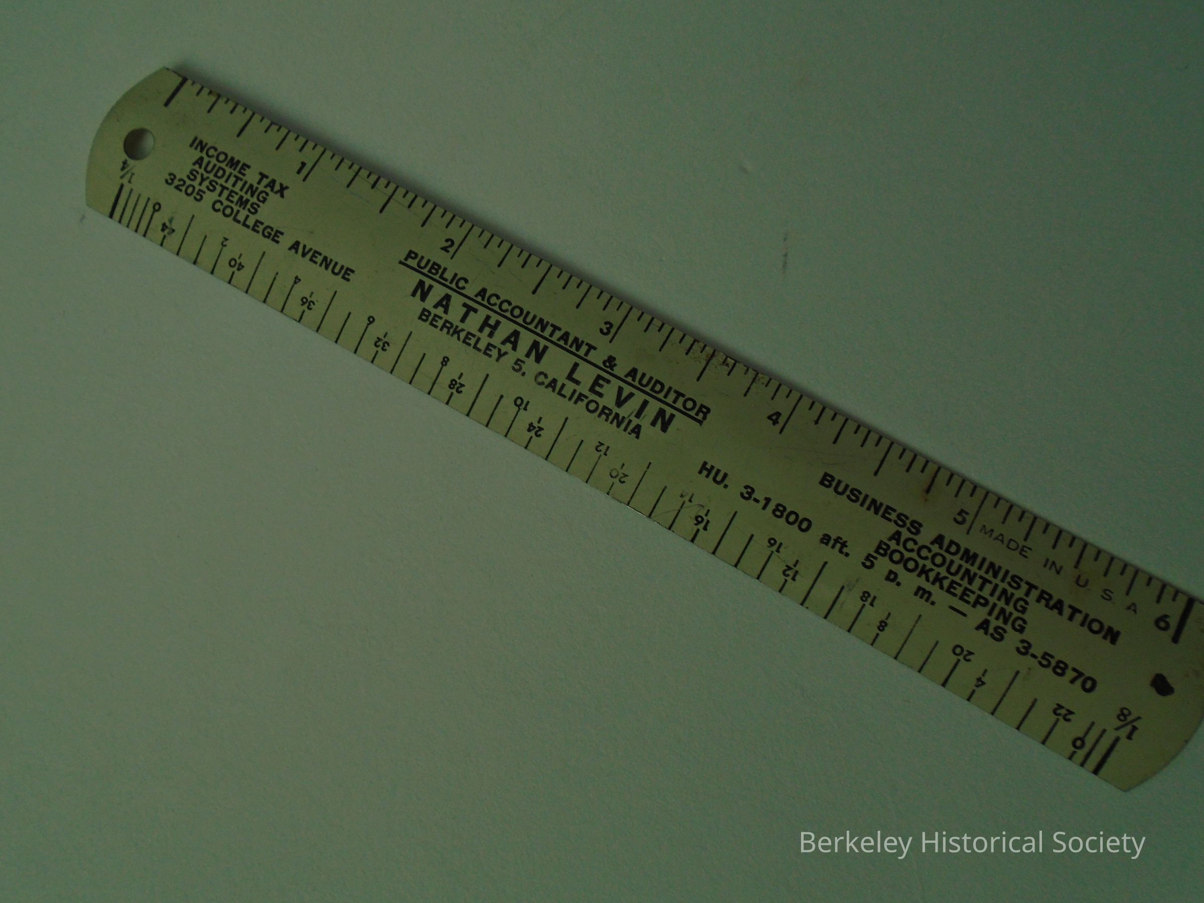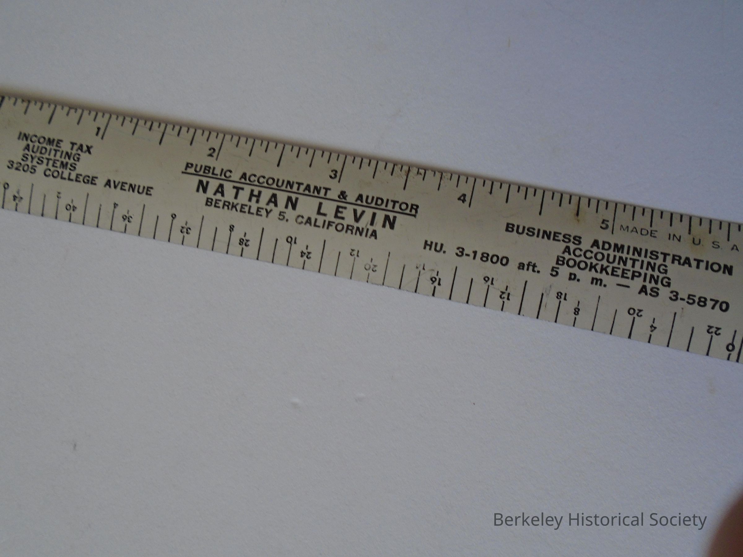 White, 6" metal ruler advertising "Nathan Levin, Public Accountant & Auditor, 3205 College Avenue, Berkeley 5, California phone HU 3-1800".