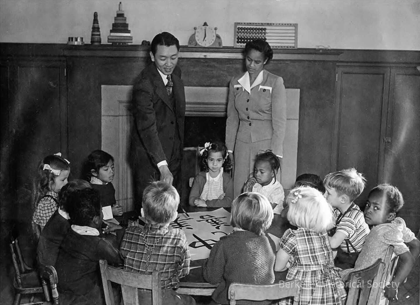 Ruth Acty and Fook Tim Chan, with her class at Longfellow School. Chan is demonstrating some Chinese characters
