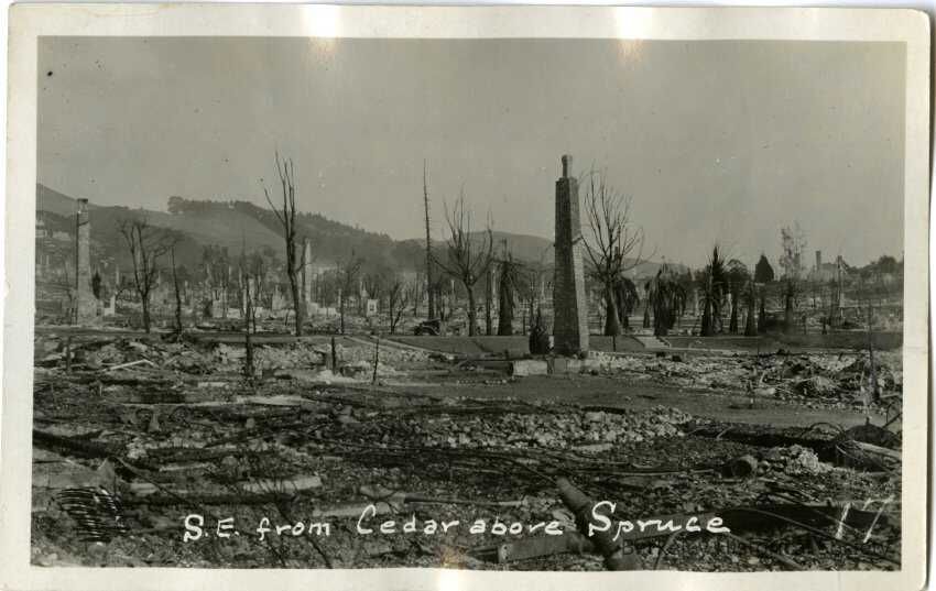 Divided postcard featuring black and white photograph of the aftermath of the 1923 Berkeley Fire from Cedar above Spruce. Title written in image; '17' at lower right