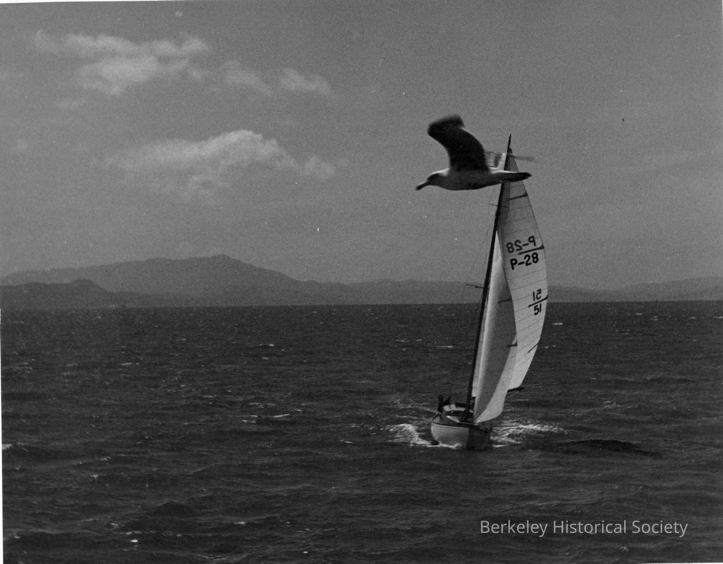 In San Francisco bay; Mt. Tamalpais in distance. Gull flying in front of line of mast.