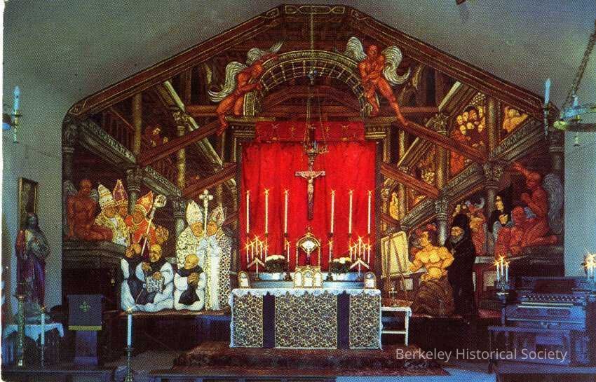 Divided postcard with color photograph interior Saint Procopius Catholic Church (built 1879), showing alter and surrounding mural. Includes message, postmark, and stamp. The church was originall the Frist Presbyterian Church of West Berkeley, later Westminster Presbyterian Church. The mural is by Gerald Gaxiola