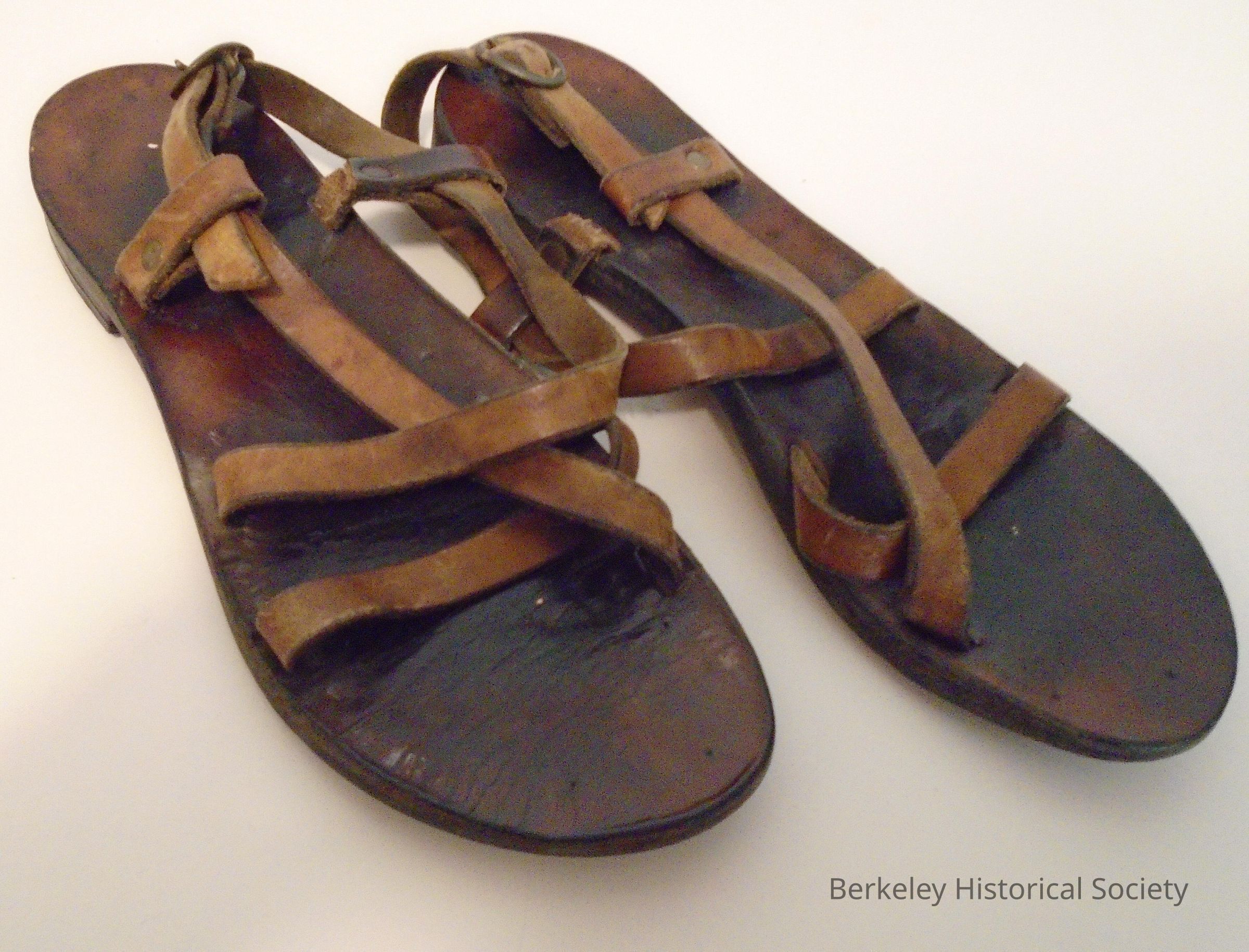 Brown leather sandals. Strap around heel with buckle. May be from A Sandal Shop in Berkeley in the 1960's.
