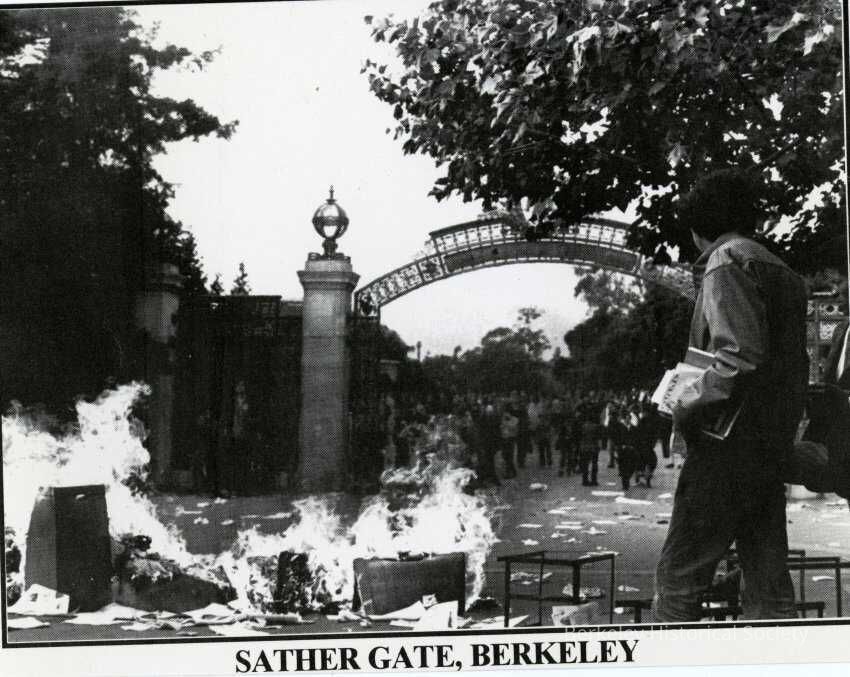 Postcard featuring black and white photograph of fire in front of Sather Gate.