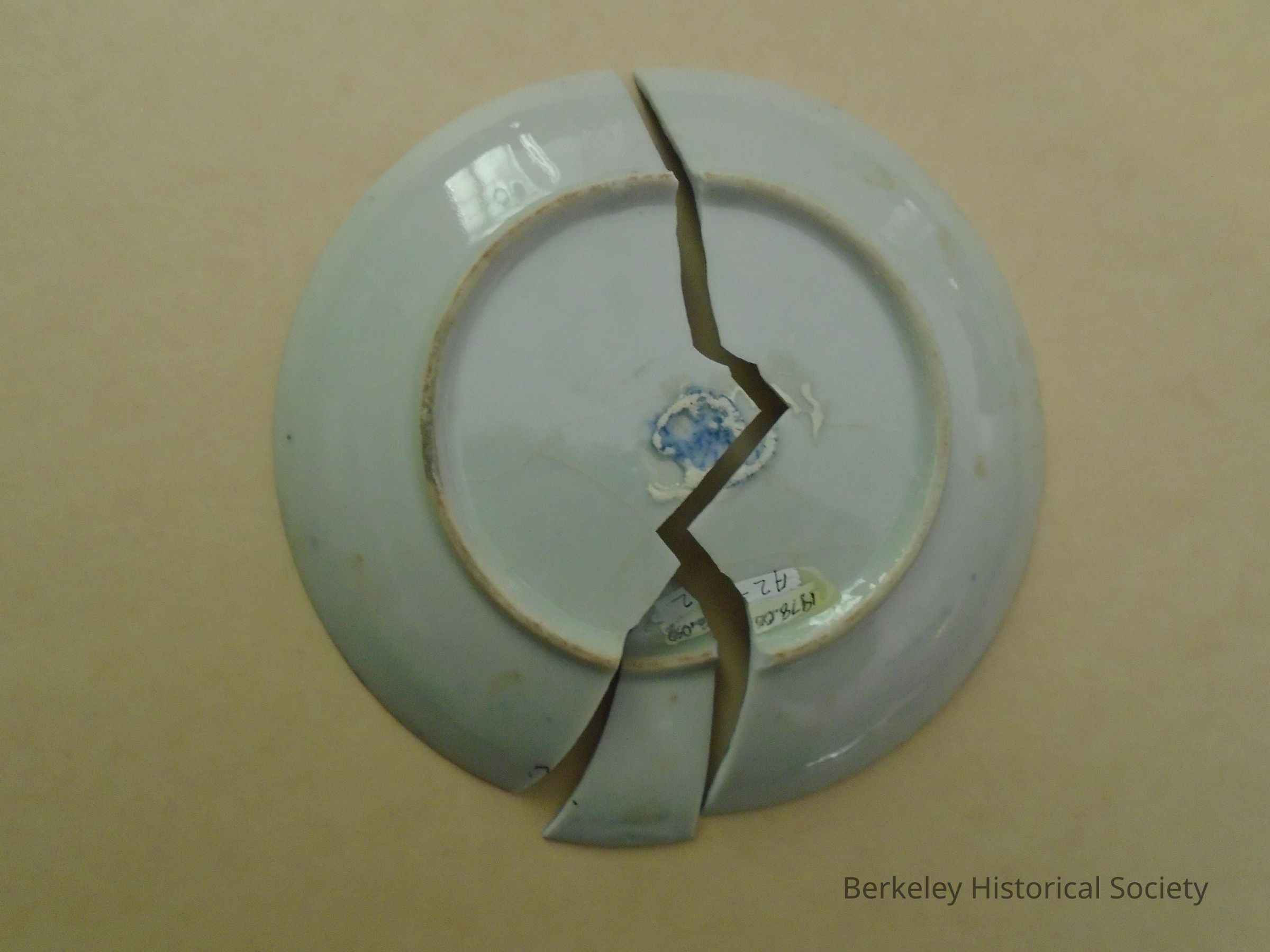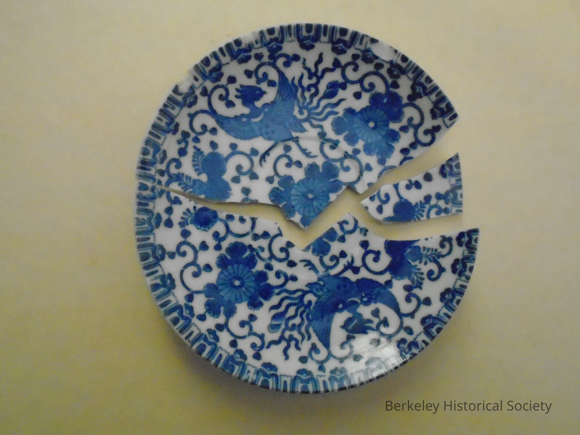 White saucer with blue pattern of flowers, vines and mythical birds. Stamped on bottom in blue. Mark on bottom where this saucer picked up glaze from another saucer, perhaps when being fired or before. Broken in three places.