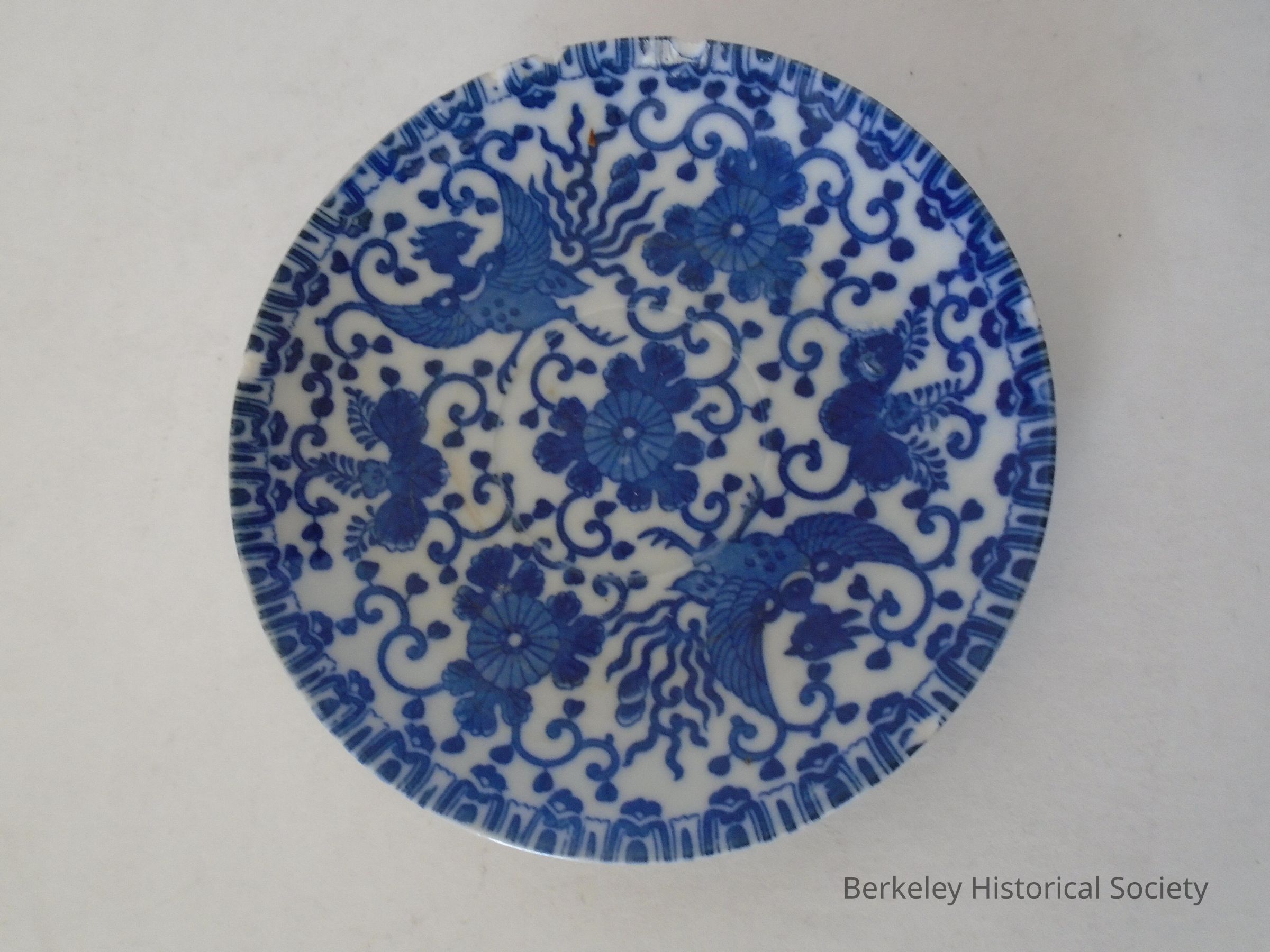 White saucer with blue pattern of flowers, vines and mythical birds. Stamped "Made in Japan" on bottom in blue. Stripe of blue glaze caught in white glaze on bottom of saucer. Chipped in five places around the edge.