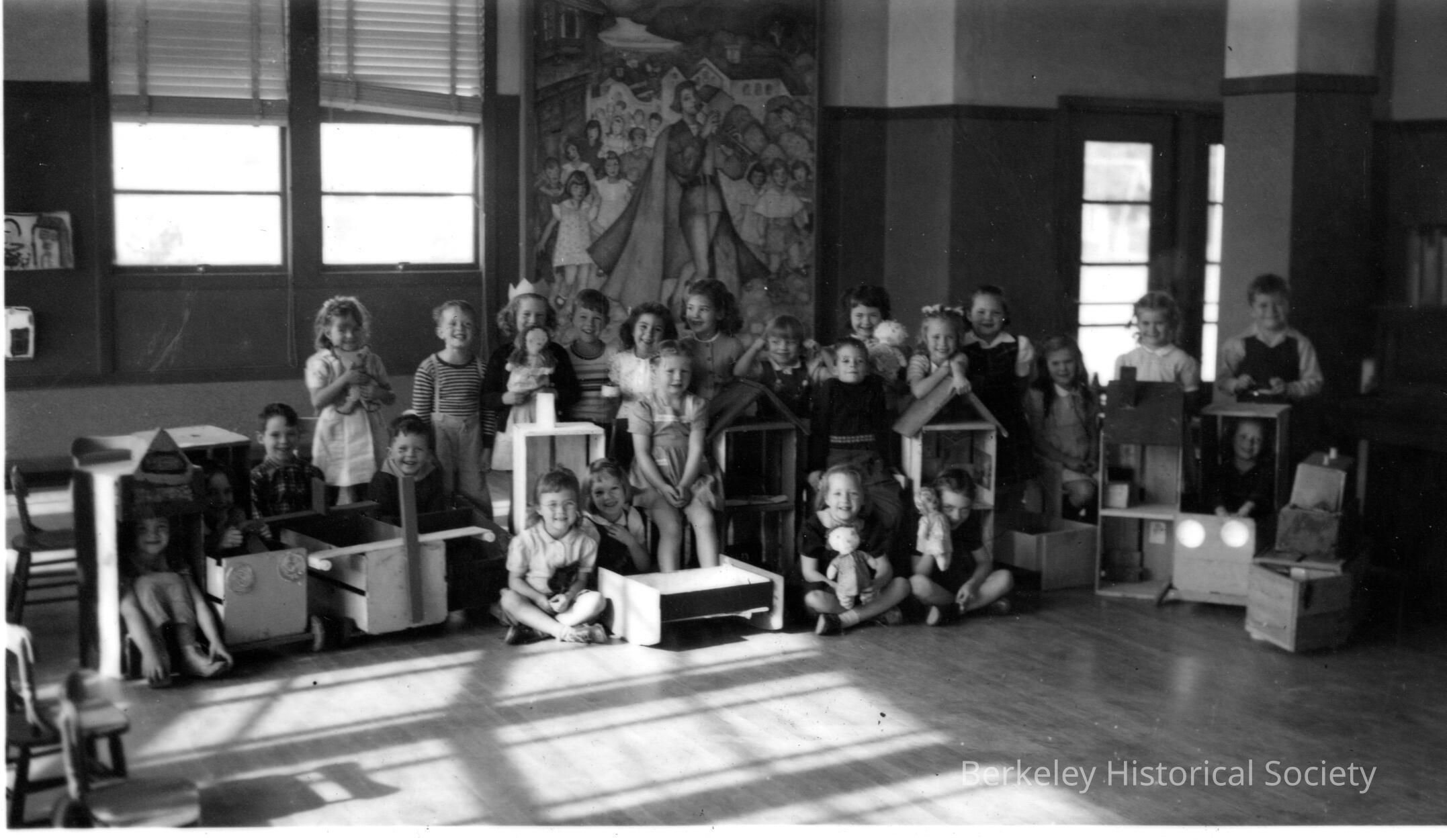Children posed by a wall of room; a few boys in homemade toy cars. Unidentified school.Other Names and Numbers