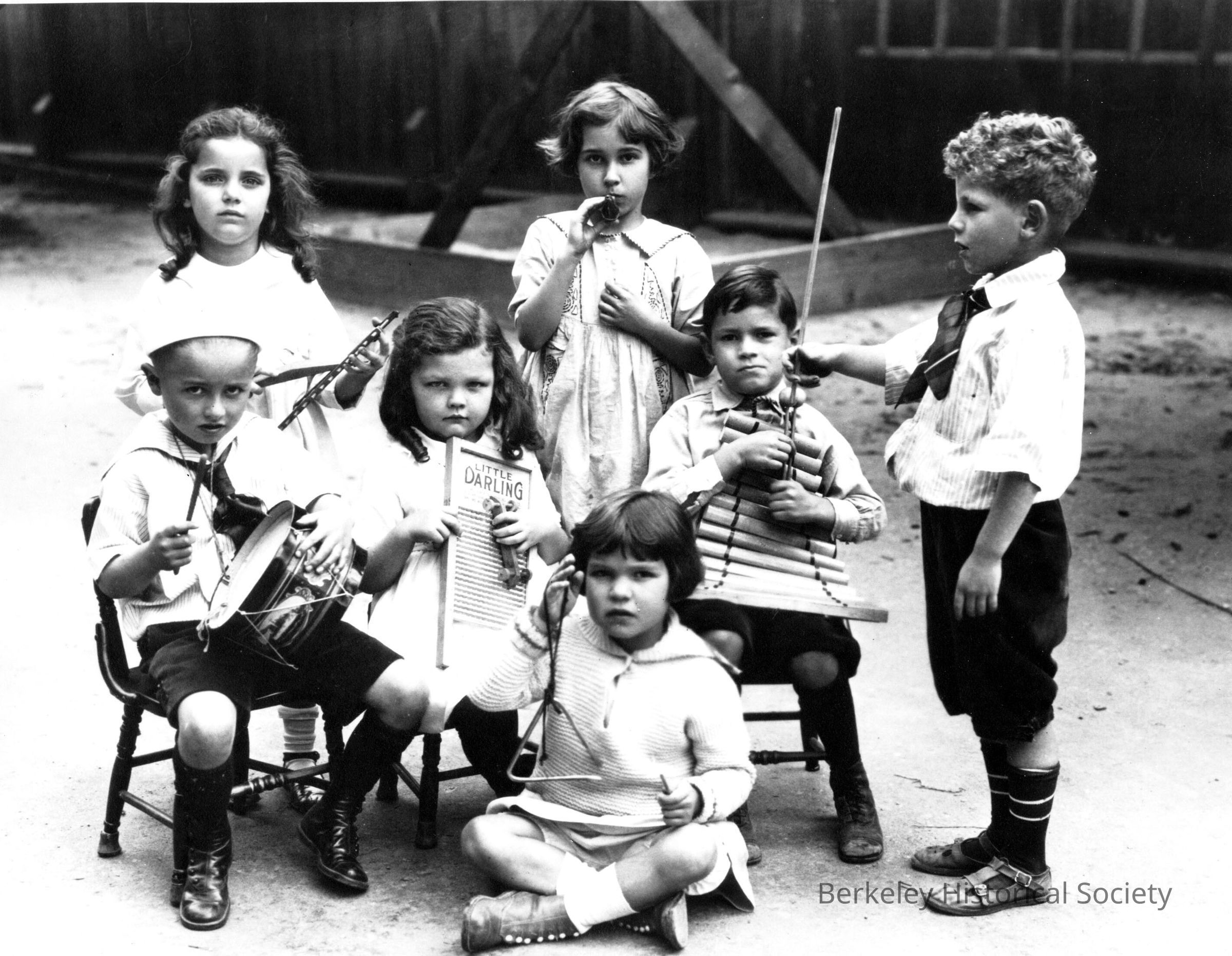 Seven school children playing music with washboard, triangle, drum, horn; one with baton, in school yard. School uncertain, possibly Emerson.Other Names and Numbers