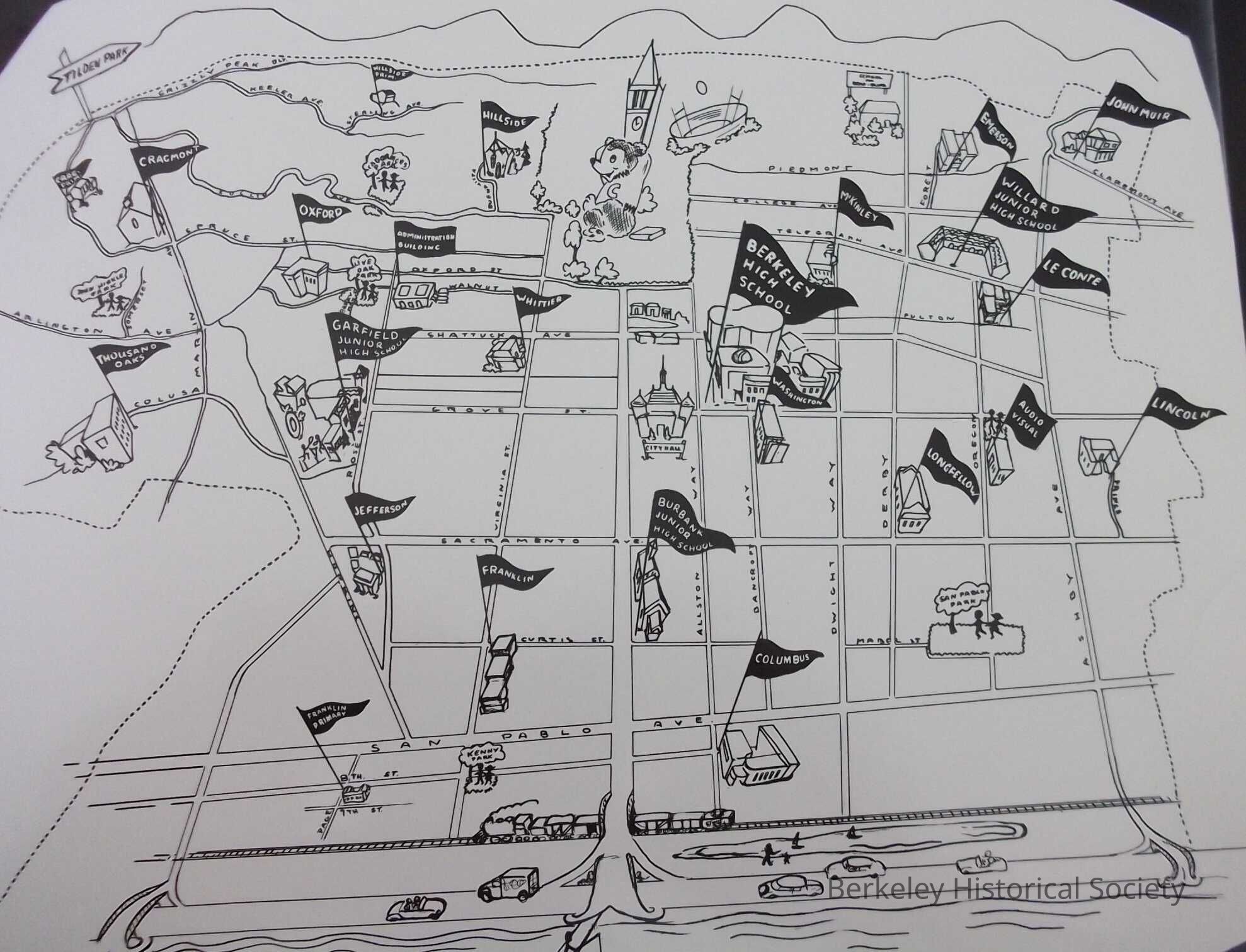 Berkeley Schools, Berkeley High School, Columbia, Whittier, Willard, Longfellow, Thousand Oaks, Hillside, Lincoln, Burbank Junior, Garfield Junior, Cragmont, Emerson, Le Conte, McKinely, Jeffrerson, Franklin