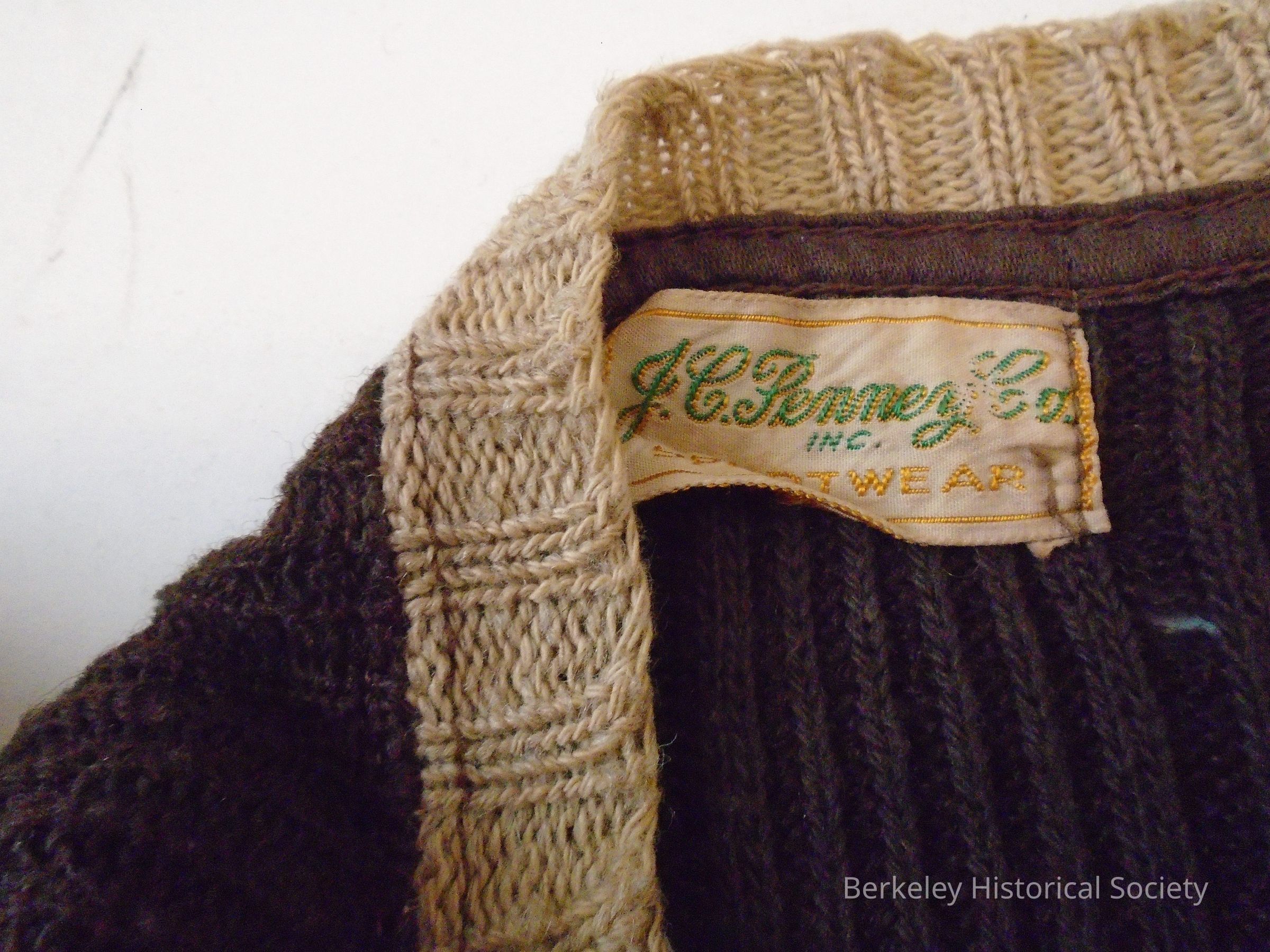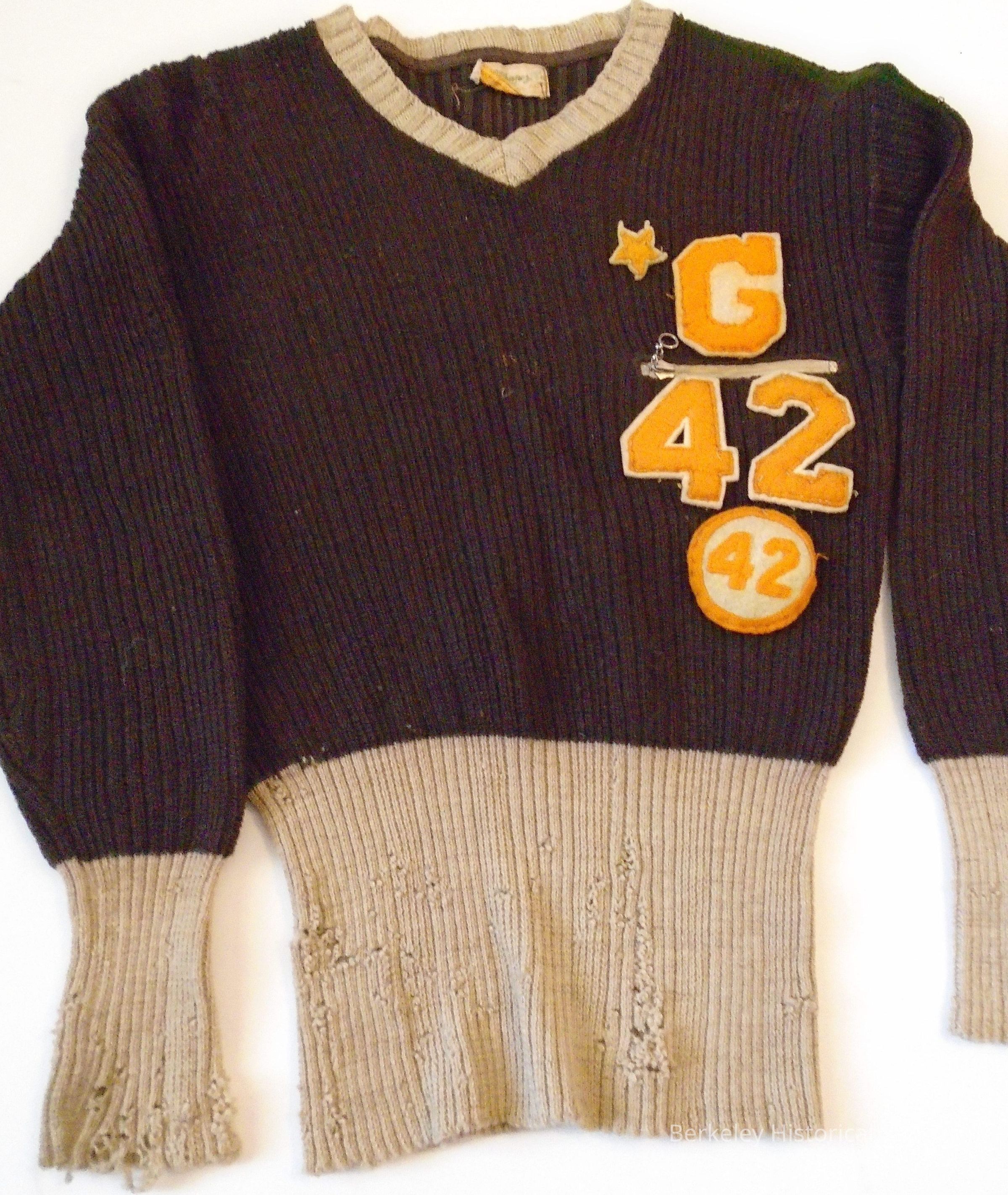 Garfield Junior High School sweater. Brown wool with beige trim. Gold felt "G" and "42", zipper pocket on left side. Label shows "J.C. Penny Co., Inc.". Belonged to Paul Caster.Made/Created