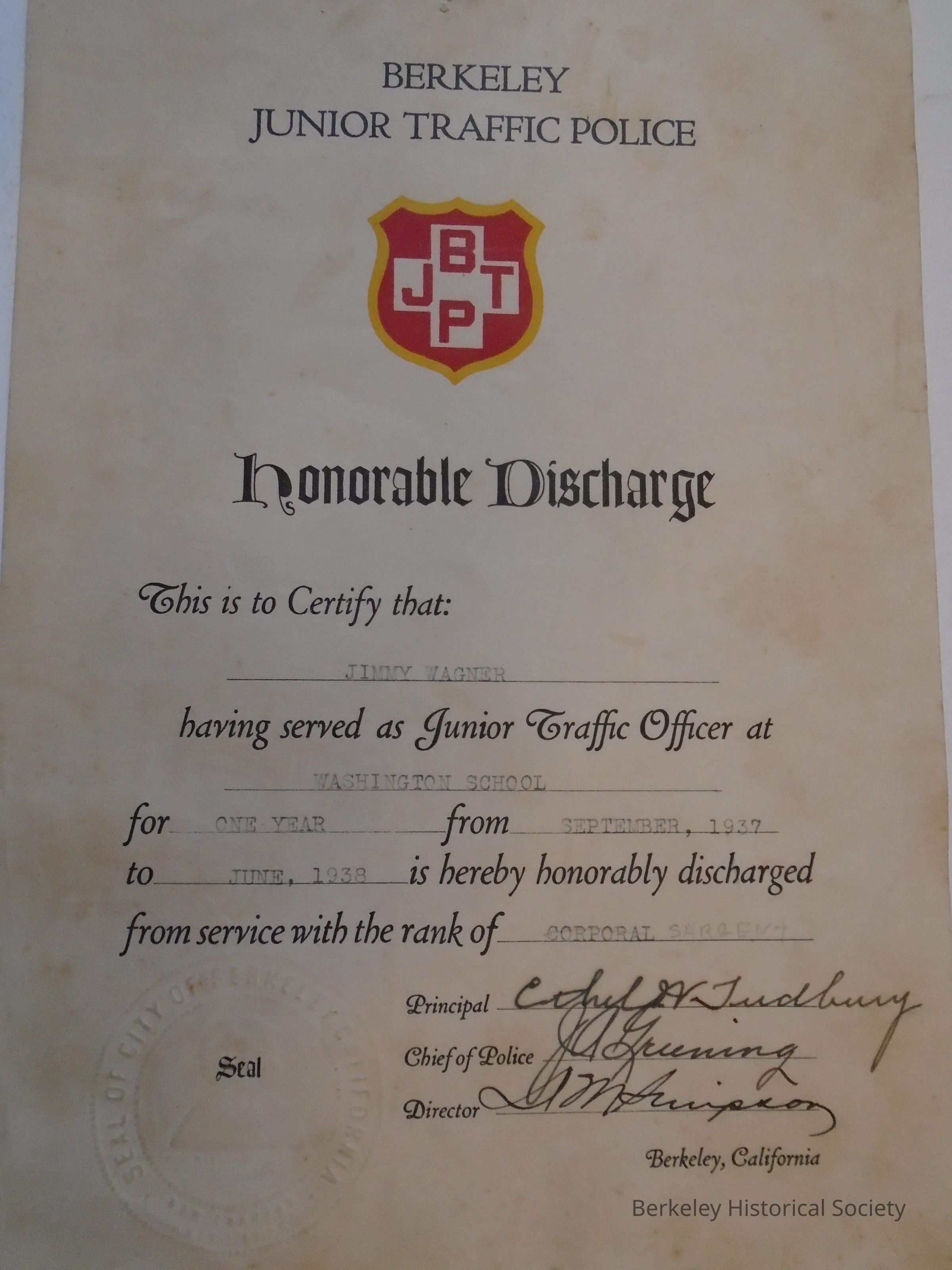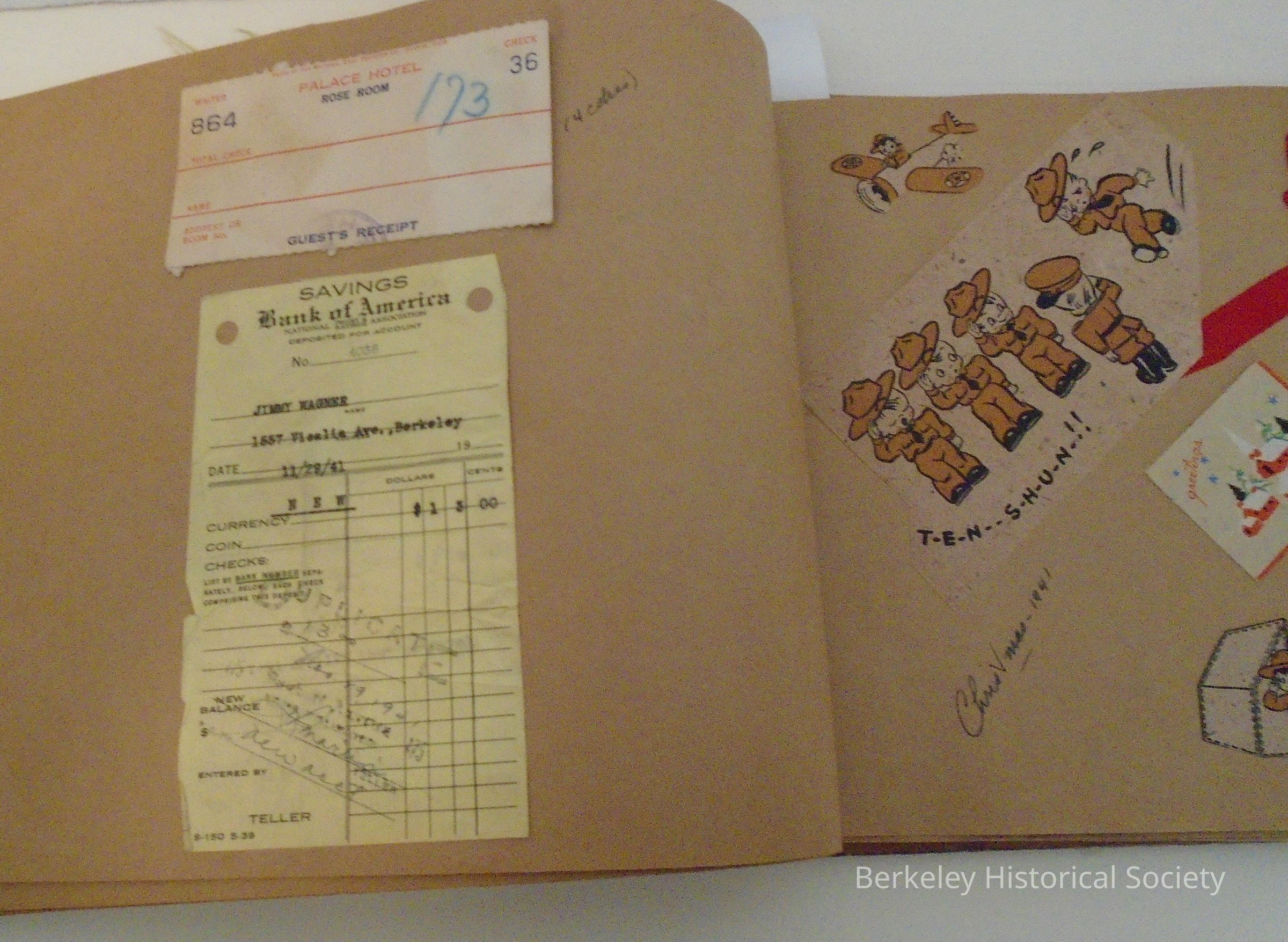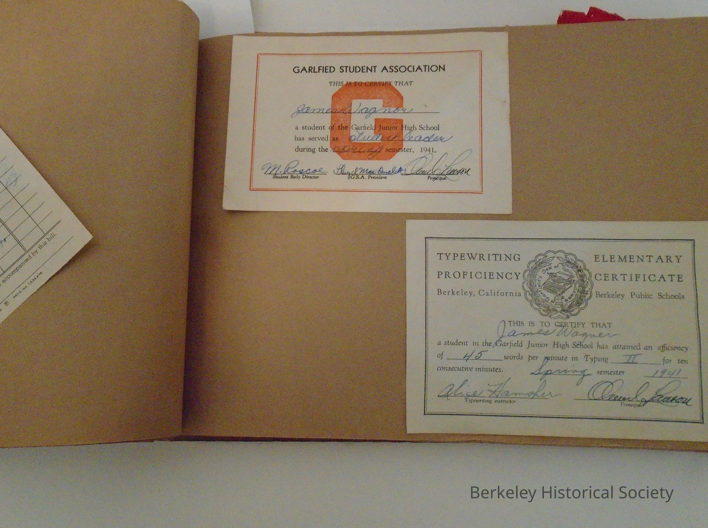 Scrapbook with wooden cover belonging to Jimmy (James) Wagner, 1557 Visalia Ave., Berkeley. Held together with leather and tacks. In relief on cover: slumbering man/sombrero and "Berkeley, Calif." Contains holiday cards and memoribilia relating to Garfield Junior High School and Berkeley High School, 1940-42 . Also Berkeley Junior Traffic Police certificate, Washington School, 1937-8.Lexicon