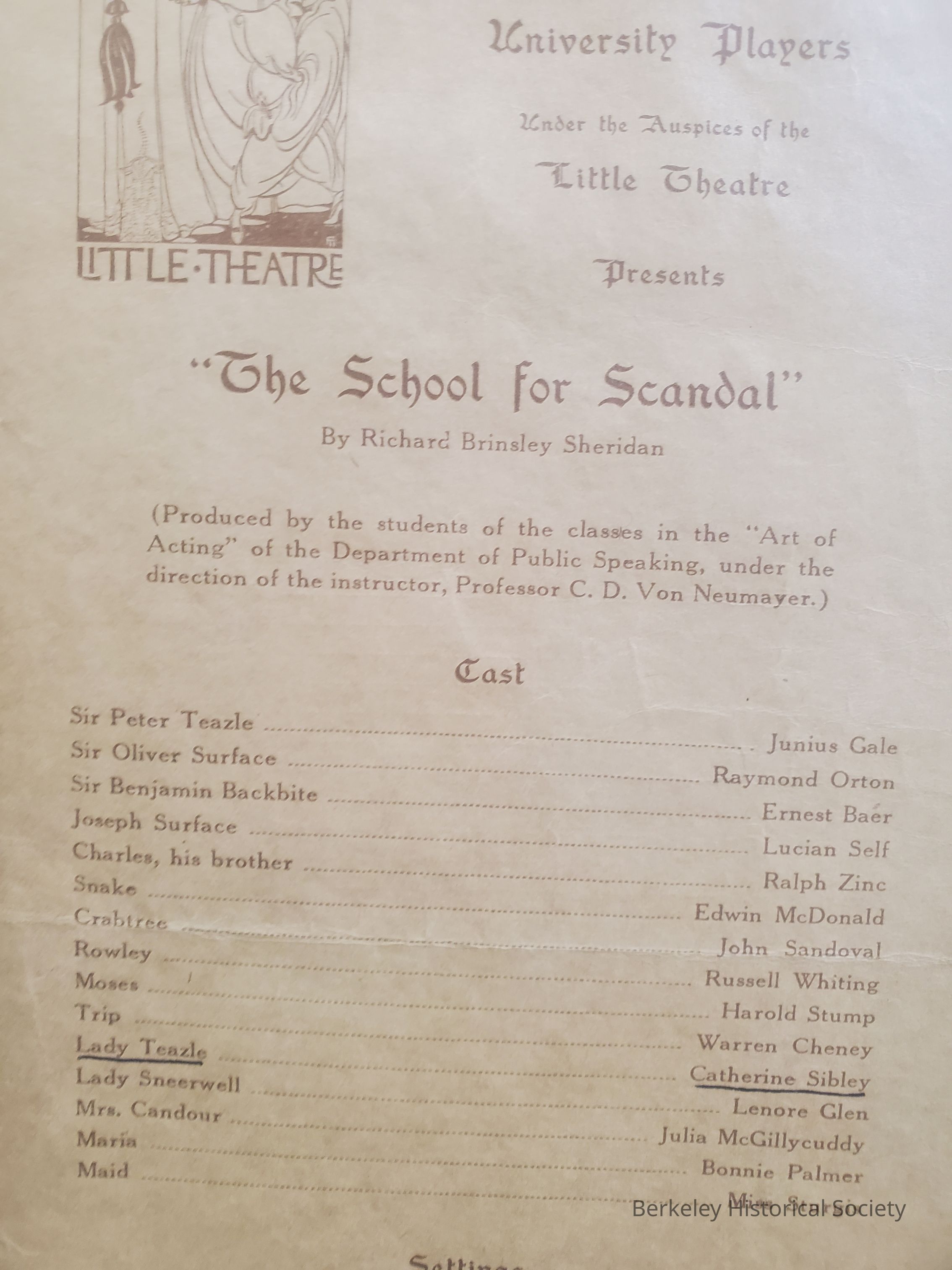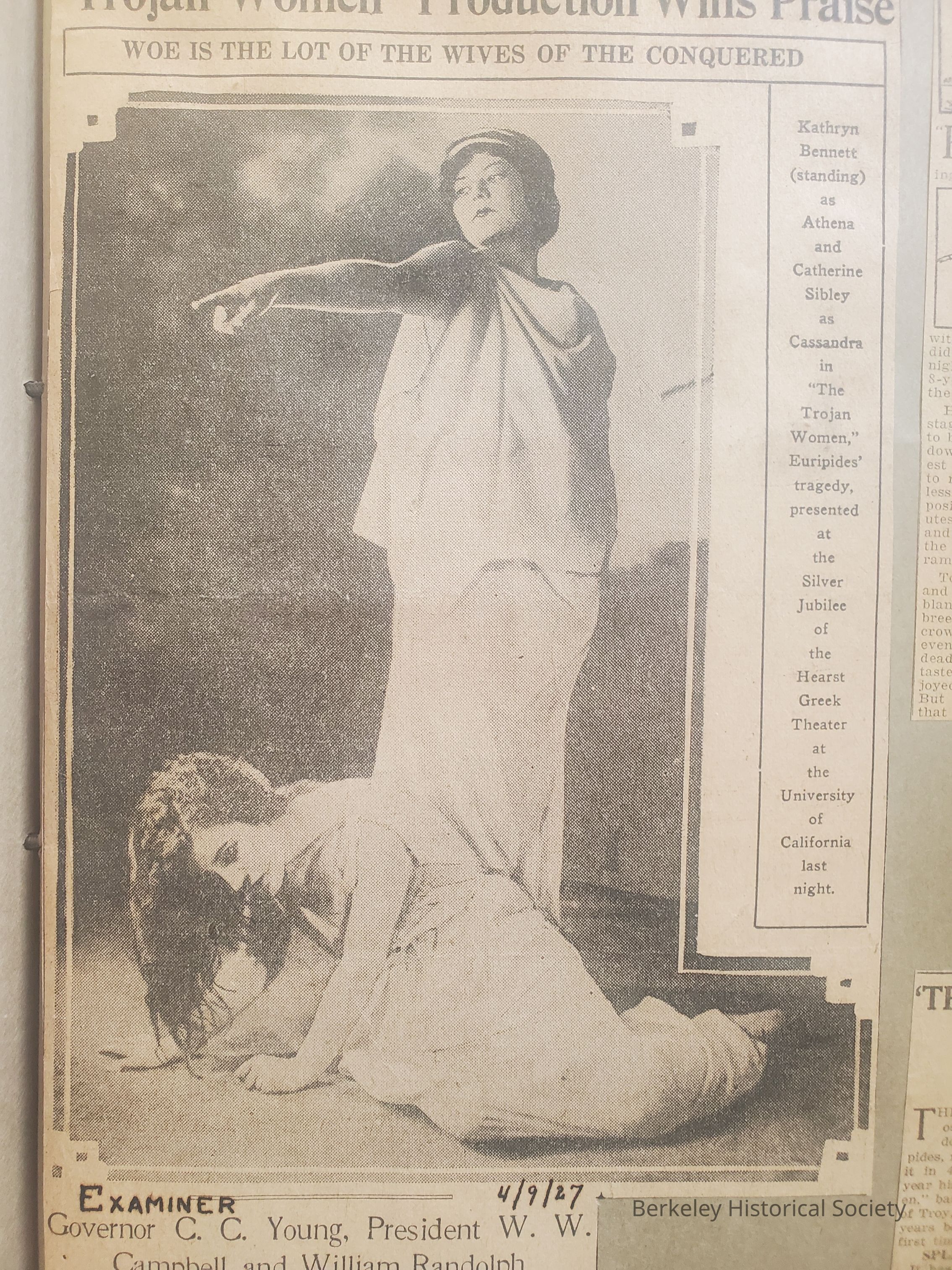 Sibley appeared in performance of The Trojan Women, at UC Berkeley Greek Theatre, and scrapbook contains some materials re subsequent professional appearances in the Bay Area.