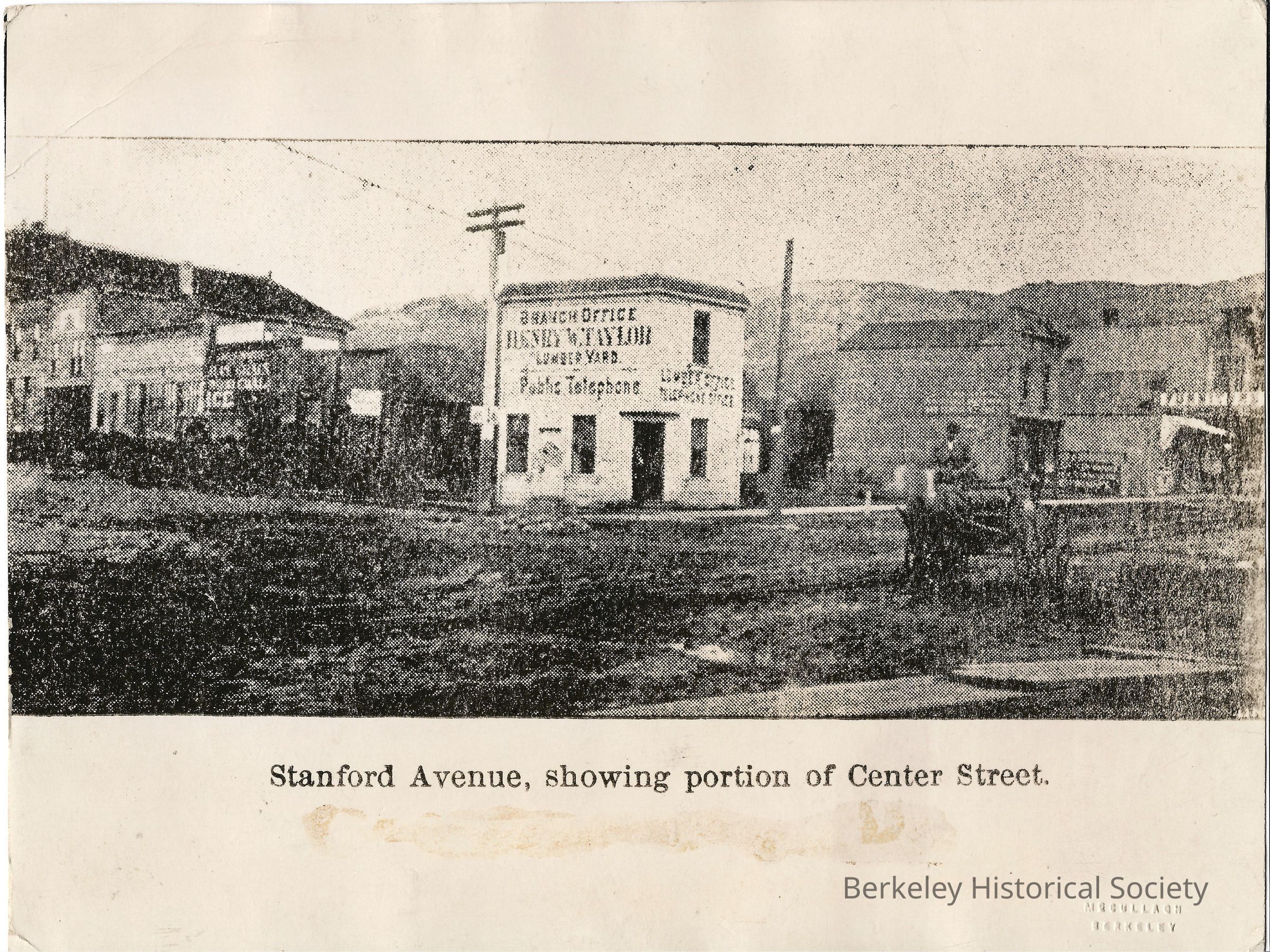 Second telephone building in Berkeley "Stanford Avenue" with Center Street (Shattuck Avenue and Center St.) Downtown Note: see S. Berkeley for first telephone office From: Telephone Museum Collection