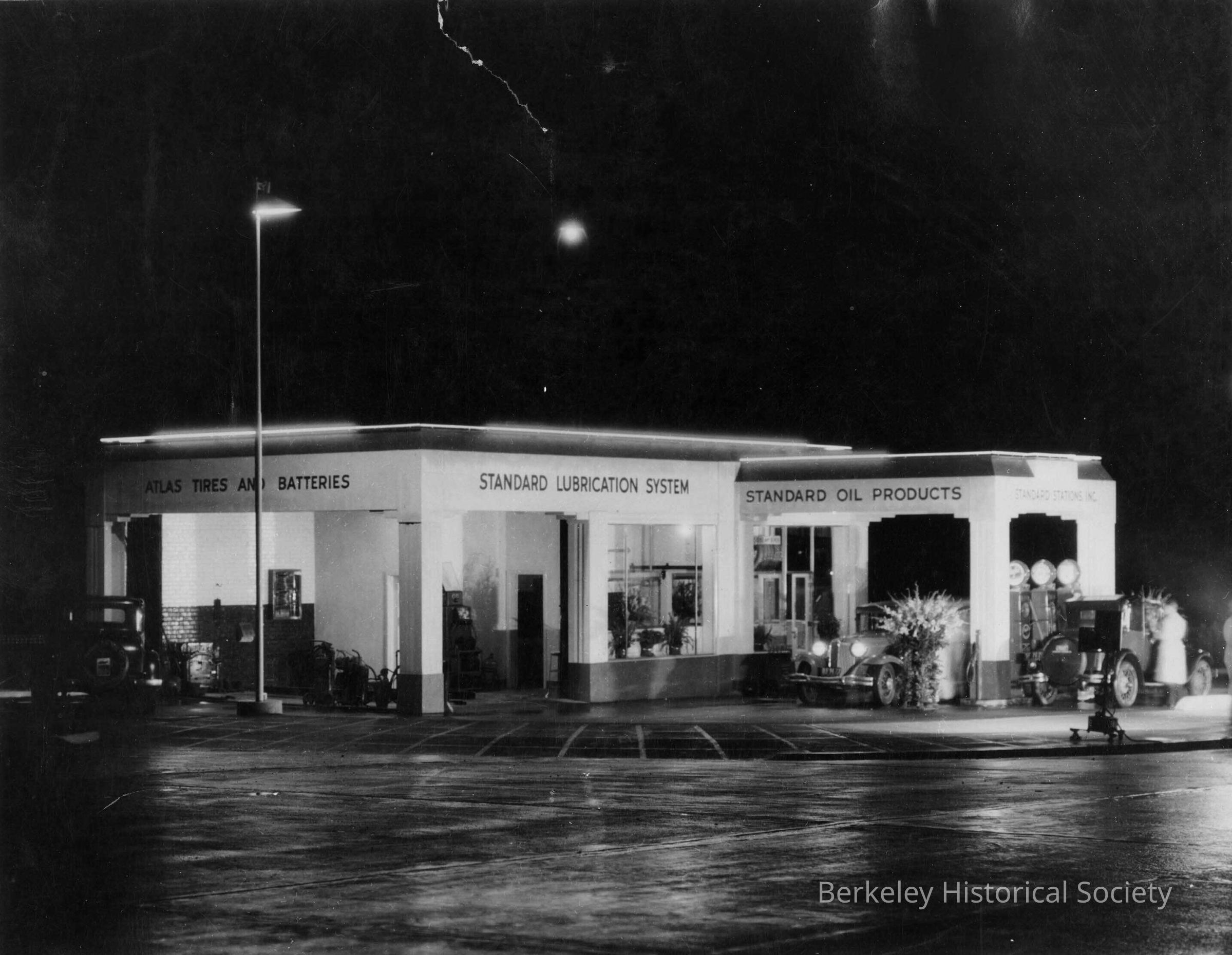 Thousand Oaks Standard station - opening night 1930's cars, flowers at the pumps Tear repaired