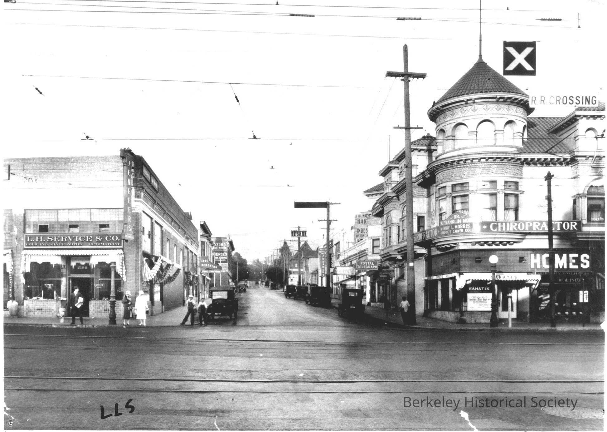 Sahatis Laces, L.H. Service & Co, Jeweler, 2199 Shattuck, J.Henry Wolbold, Real Estate, Pierces Book Store, Oxford Apartments, Golden West Grill 2108 Allston, Streetscape
