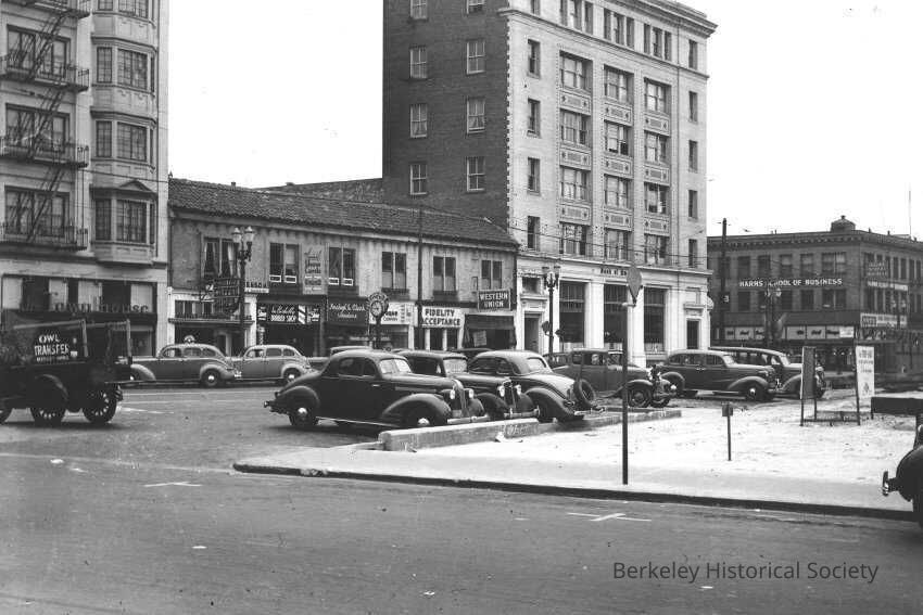 Harms School of Business, 2161 Shattuck, Bank of America (Berkeley Bank Building), Western Union, 2125 Shattuck, Fidelity Acceptance.,, Berkeley Barber Shop, Kraken & Clark, jewelers, 2119 Shattuck, Streetscape