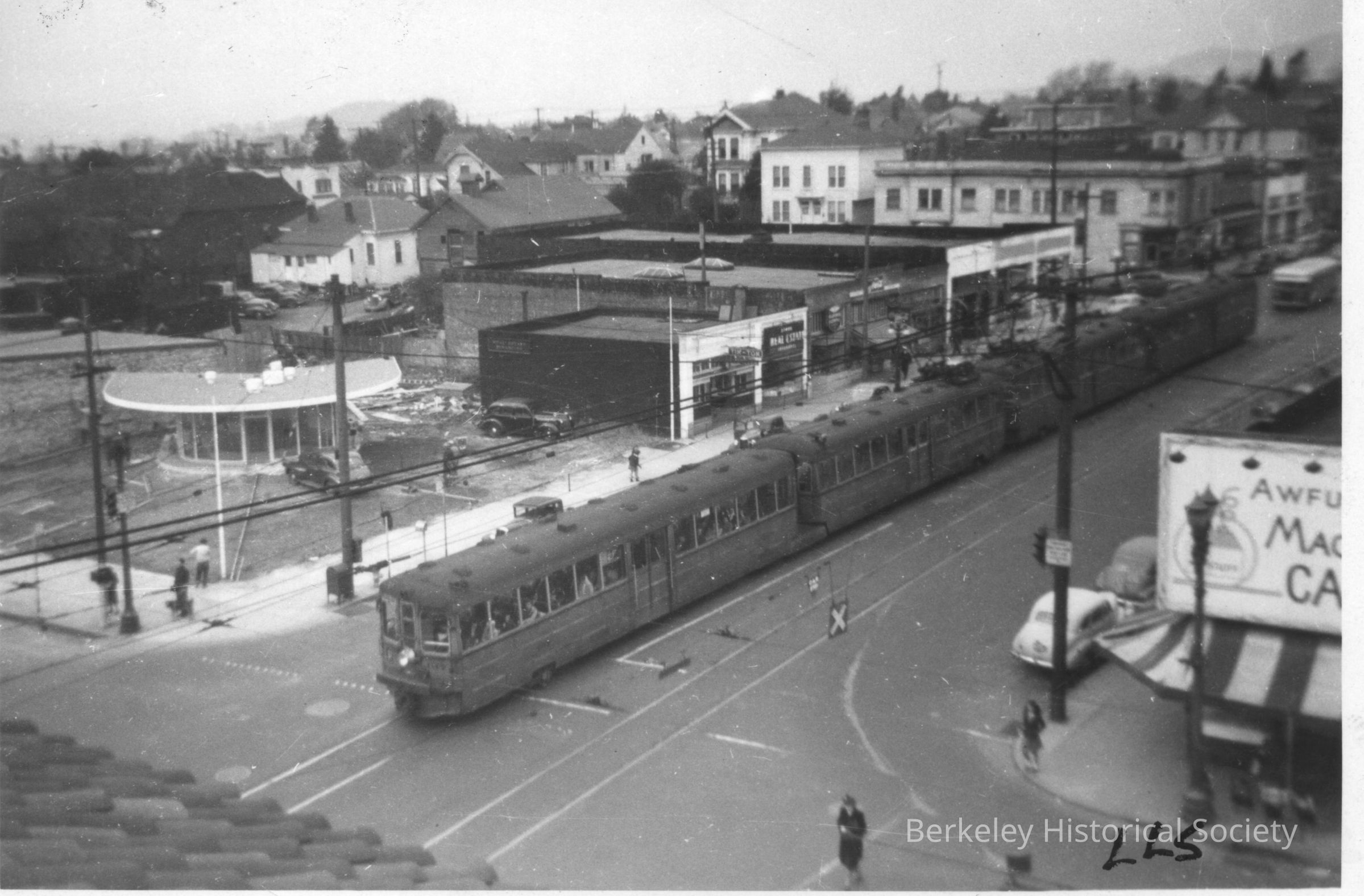 Shows train heading south, Tik Tok real estate, Fischel & Bauml barn on Berkeley Way, Grey shop, MacFarlane candy store, Cameo drive-in under construction.Made/Created