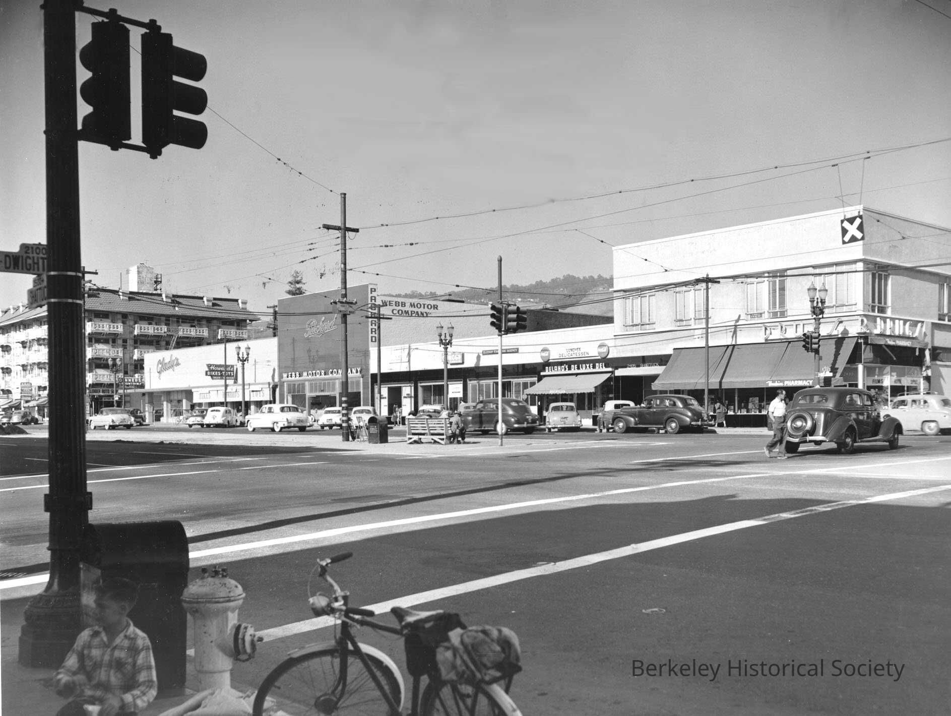 Railway Tracks, Glady's Dinner, Delano's Delux Deli, Webb Motor Company -Packard, Howard's Bikes and Toys, Railway Express Agency, Drugs -2499 Shattuck [Hoskin's], Streetscape