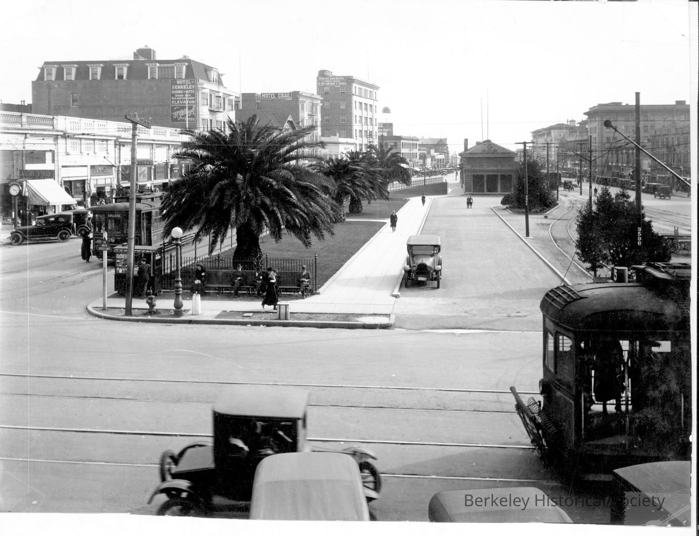 View south from University Avenue to Berkeley Station; tracks, train, cars on University Avenue in foreground.Lexicon