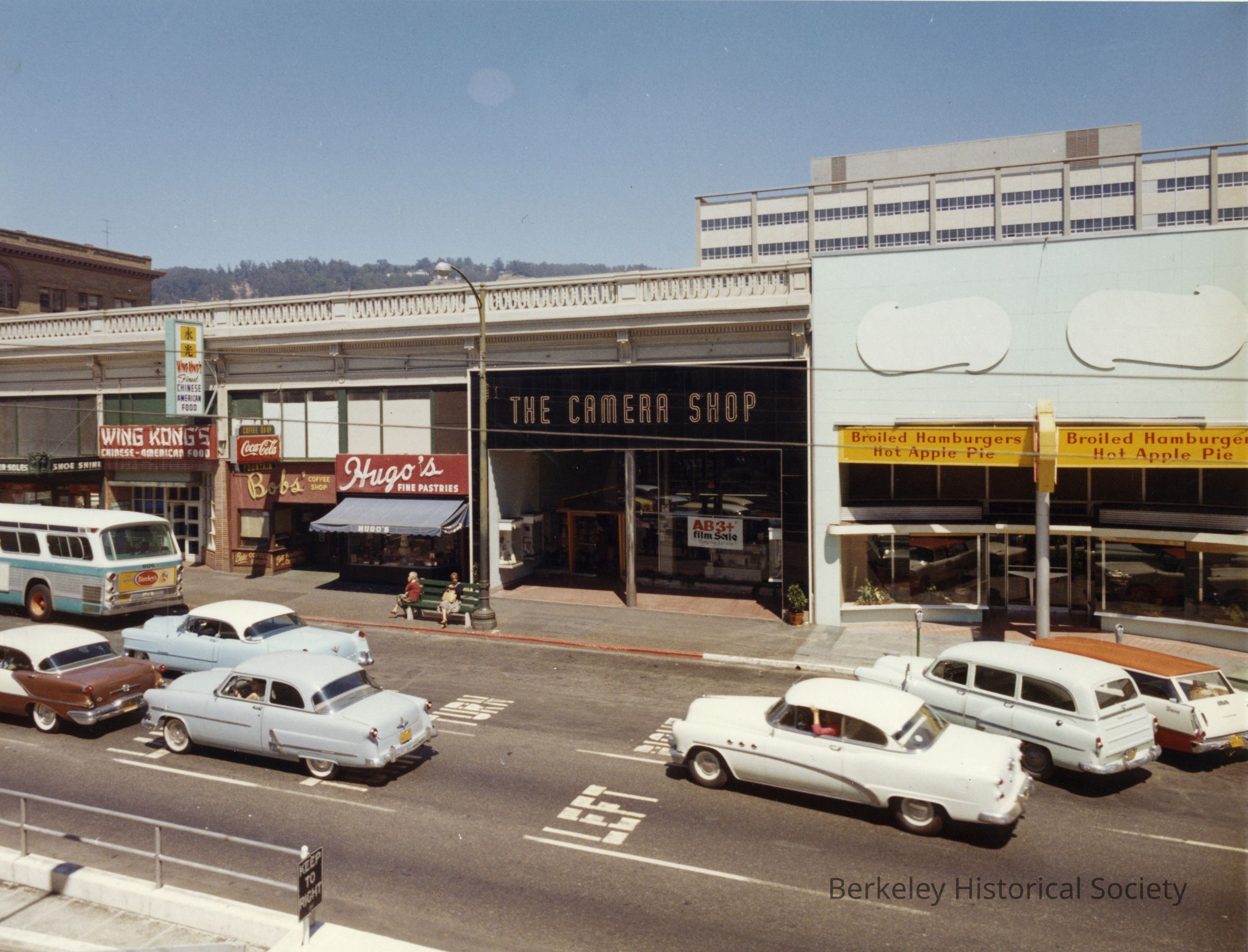 East side of Shattuck Avenue south of University Avenue. Signs include Wing Kong, Hugo's, Bob's, The Camera Shop.Lexicon