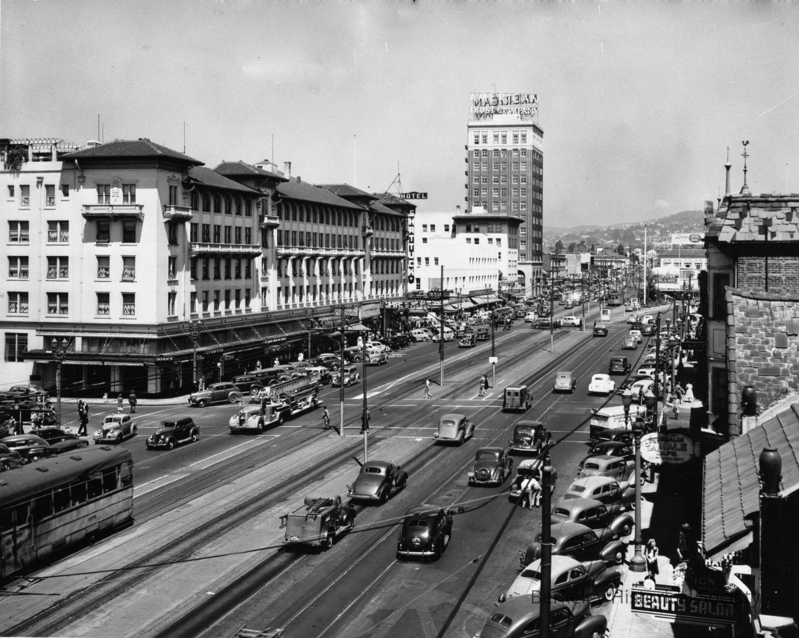 View from top of building on east side of busy street. Shattuck Hotel and American Trust Building prominent.