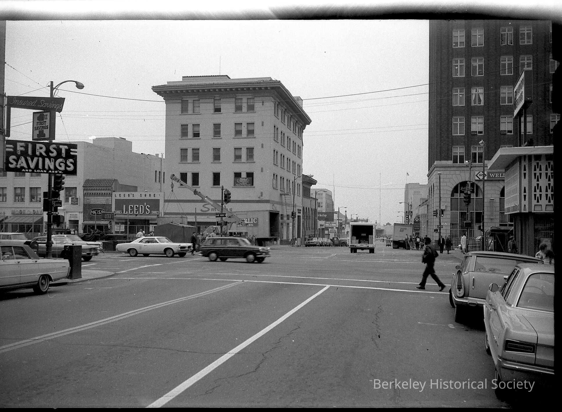 First Savings, 2151 Shattuck, Welles Fargo, Smiths, Shattuck adn Center, Leed's Shoes, 2160 Shattuck, Moss, 2164 Shattuck, Streetscape