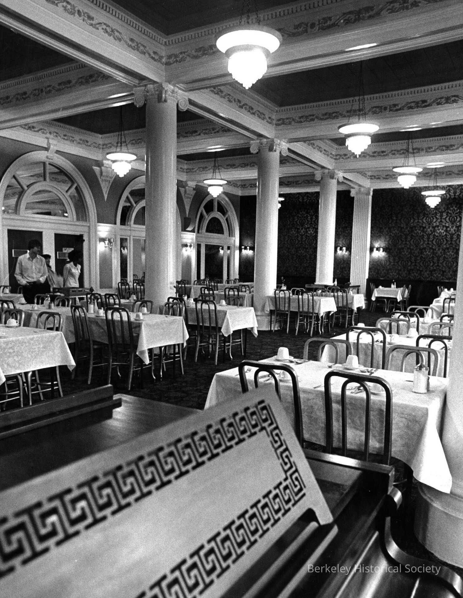 Interior of the Hotel Shattuck dining room with tables set. Piano in foreground.